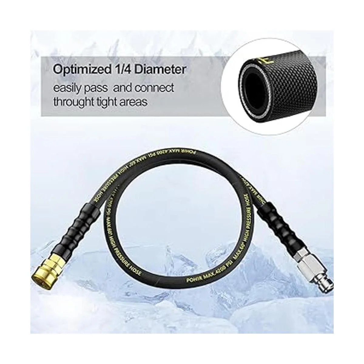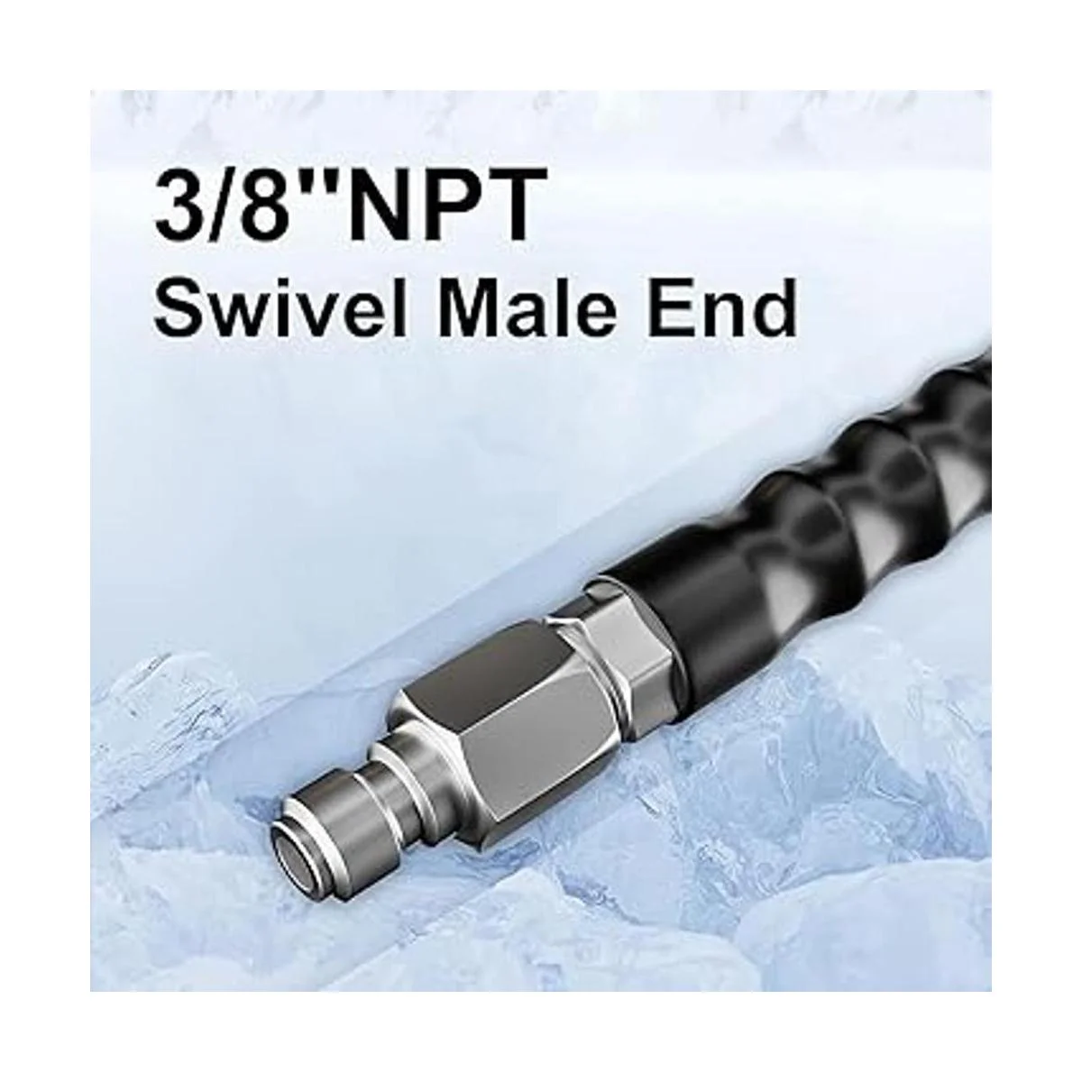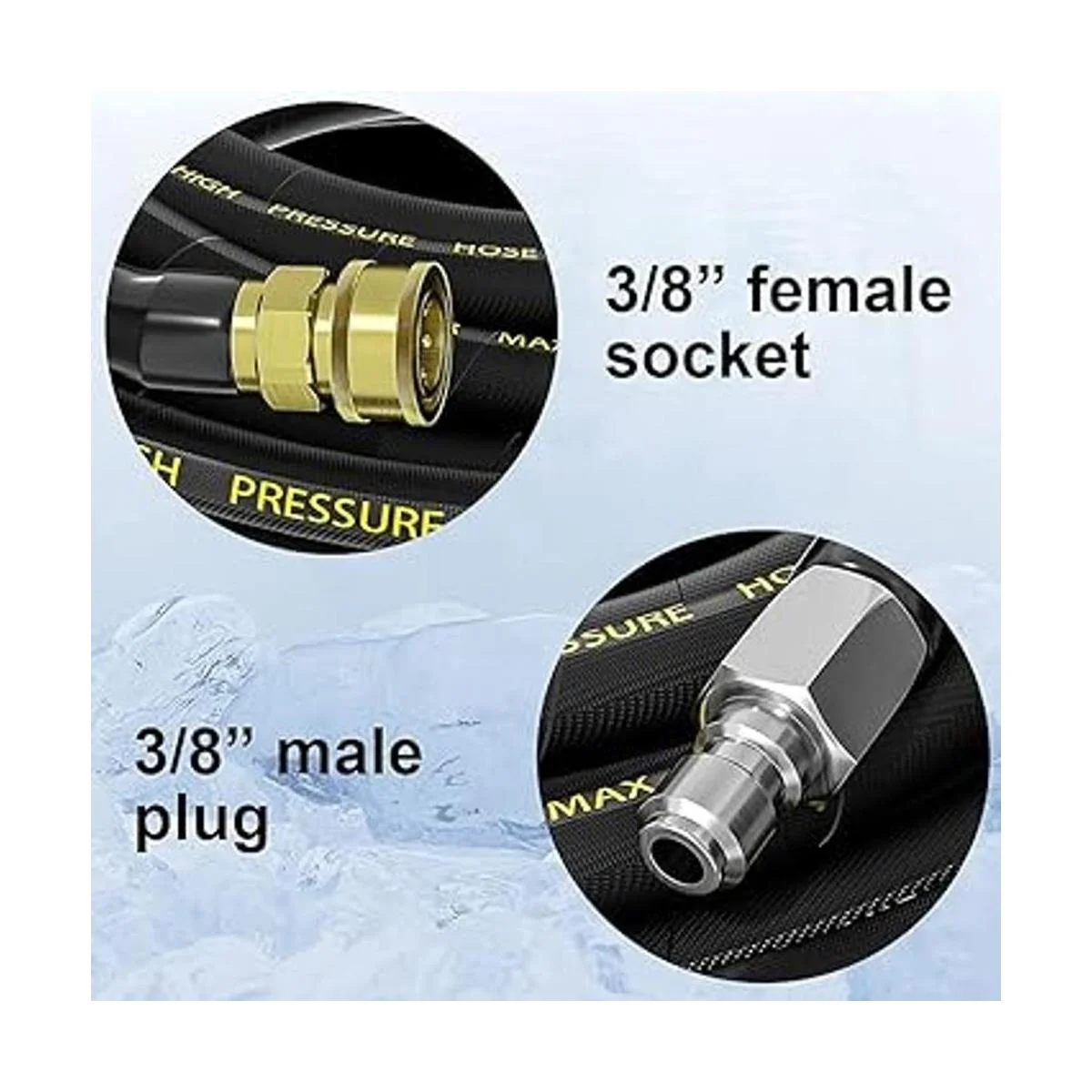 Manguera de lavado a presión de conexión rápida: la manguera de lavado a presión tiene un conector rápido en ambos extremos: enchufe de conexión rápida de 3/8 pulgadas y accesorios de desconexión rápida de 3/8 pulgadas. Estos accesorios de conexión rápida se pueden conectar fácilmente a la lavadora a presión y al pulverizador.