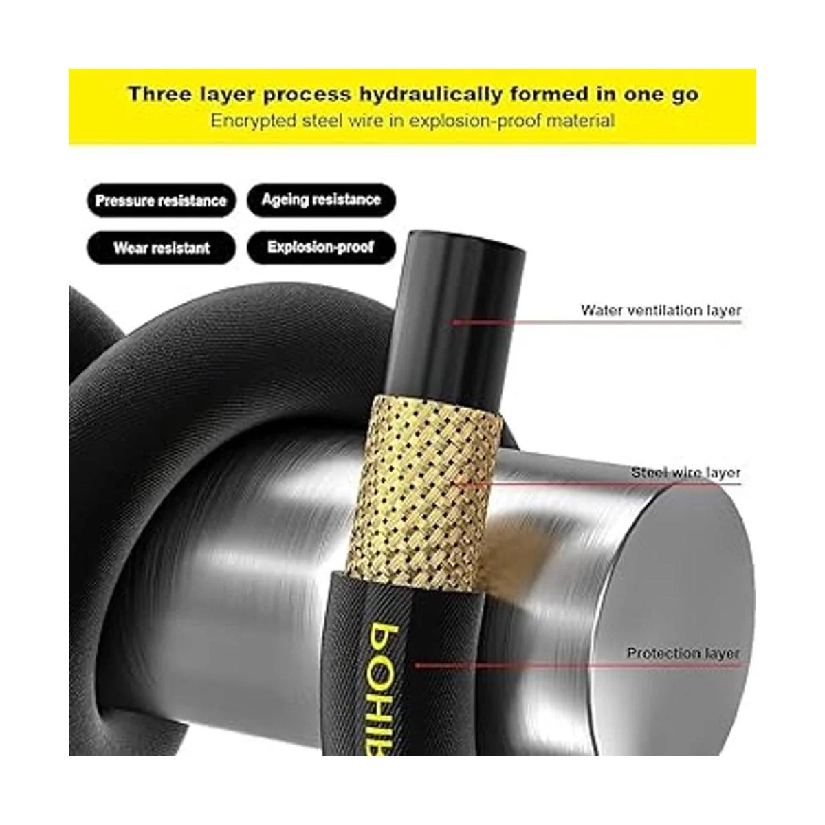 Manguera de lavado a presión resistente: manguera de presión trenzada con una construcción de refuerzo compuesta de alambre de alta resistencia, construcción resistente a arañazos y marcas para una vida útil prolongada.
