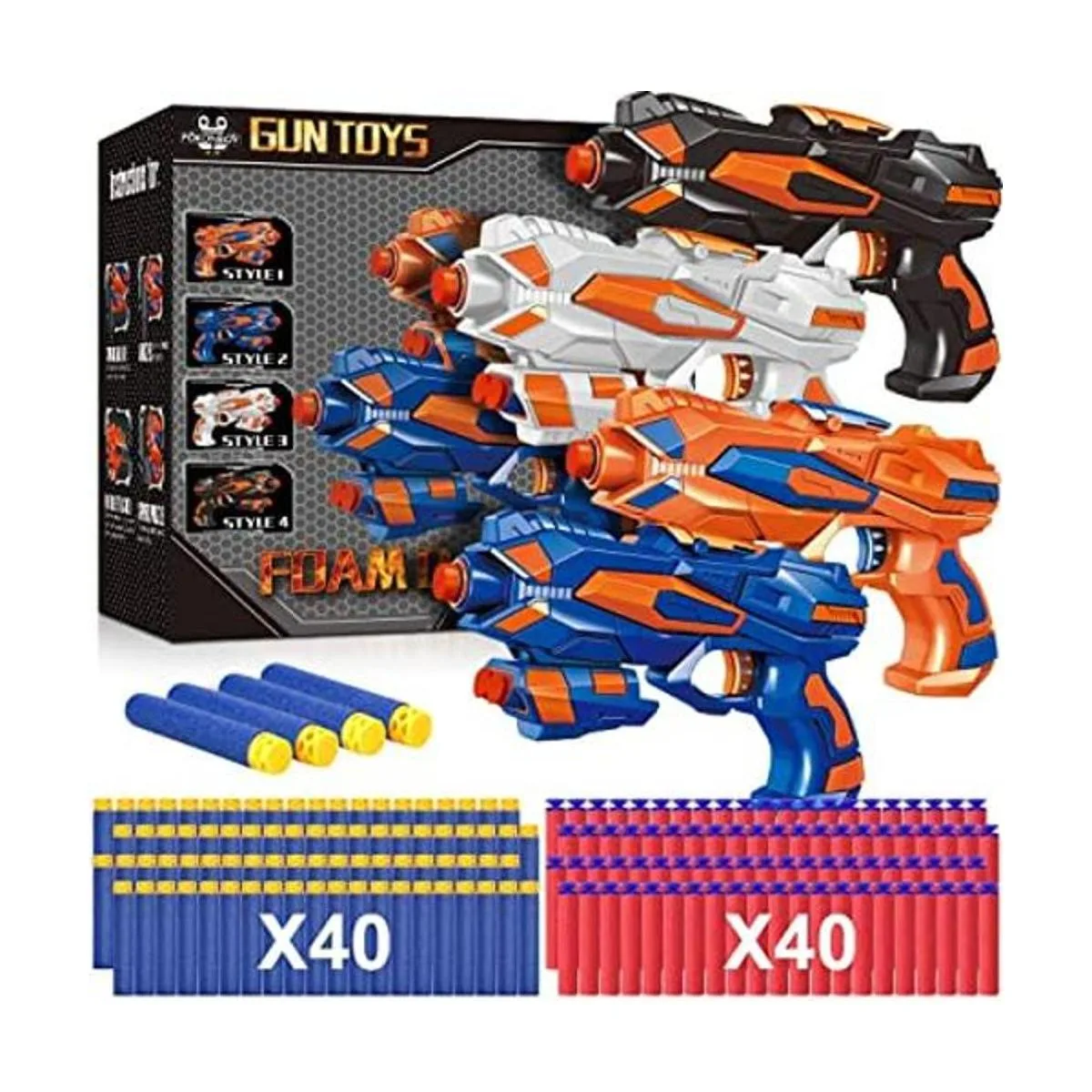POKONBOY Paquete de 4 pistolas de pistola compatibles con balas Nerf, pistolas de juguete para niños y niñas con 80 dardos de repuesto de espuma, juguetes de pistola de mano para niños de 6 años de edad, cumpleaños y Navidad