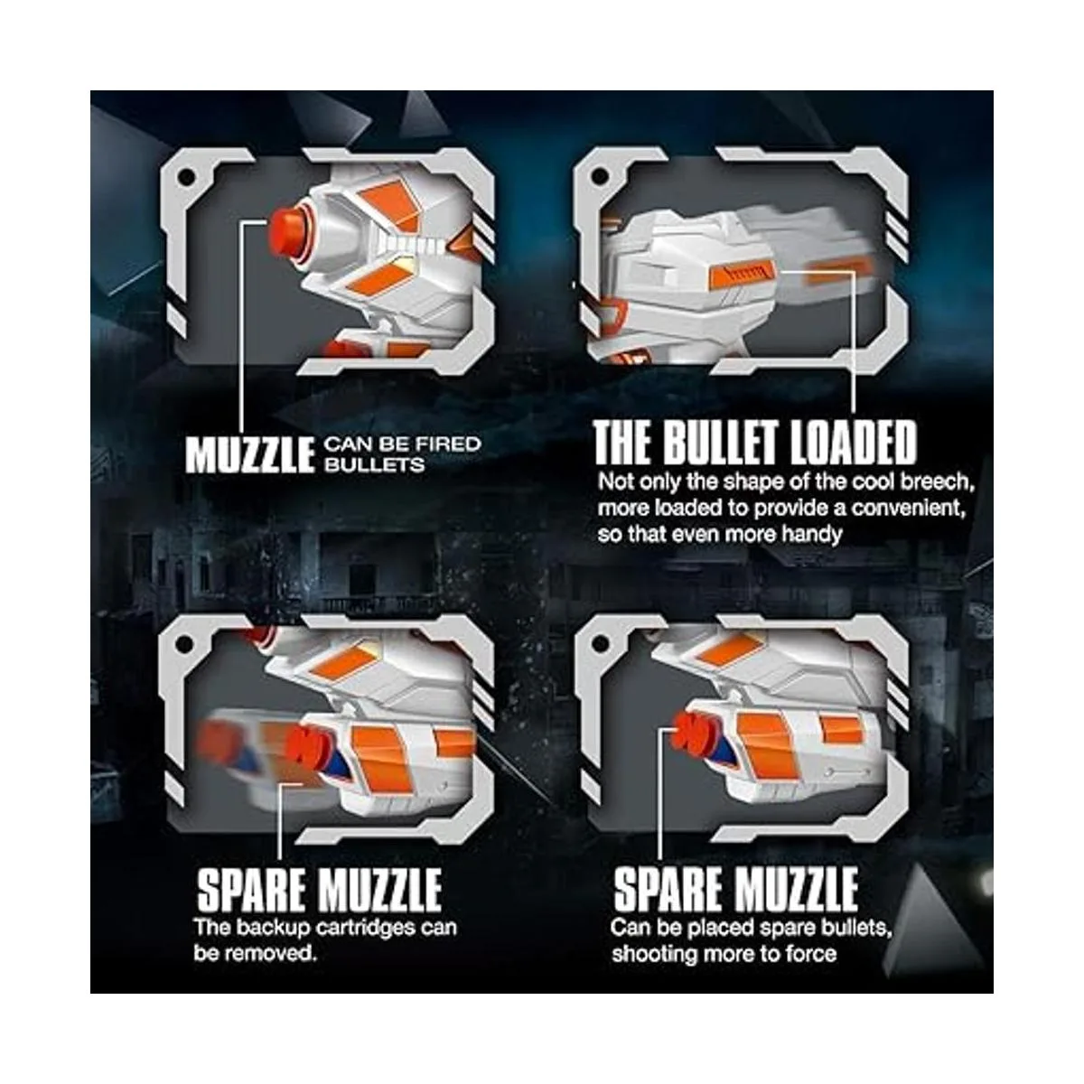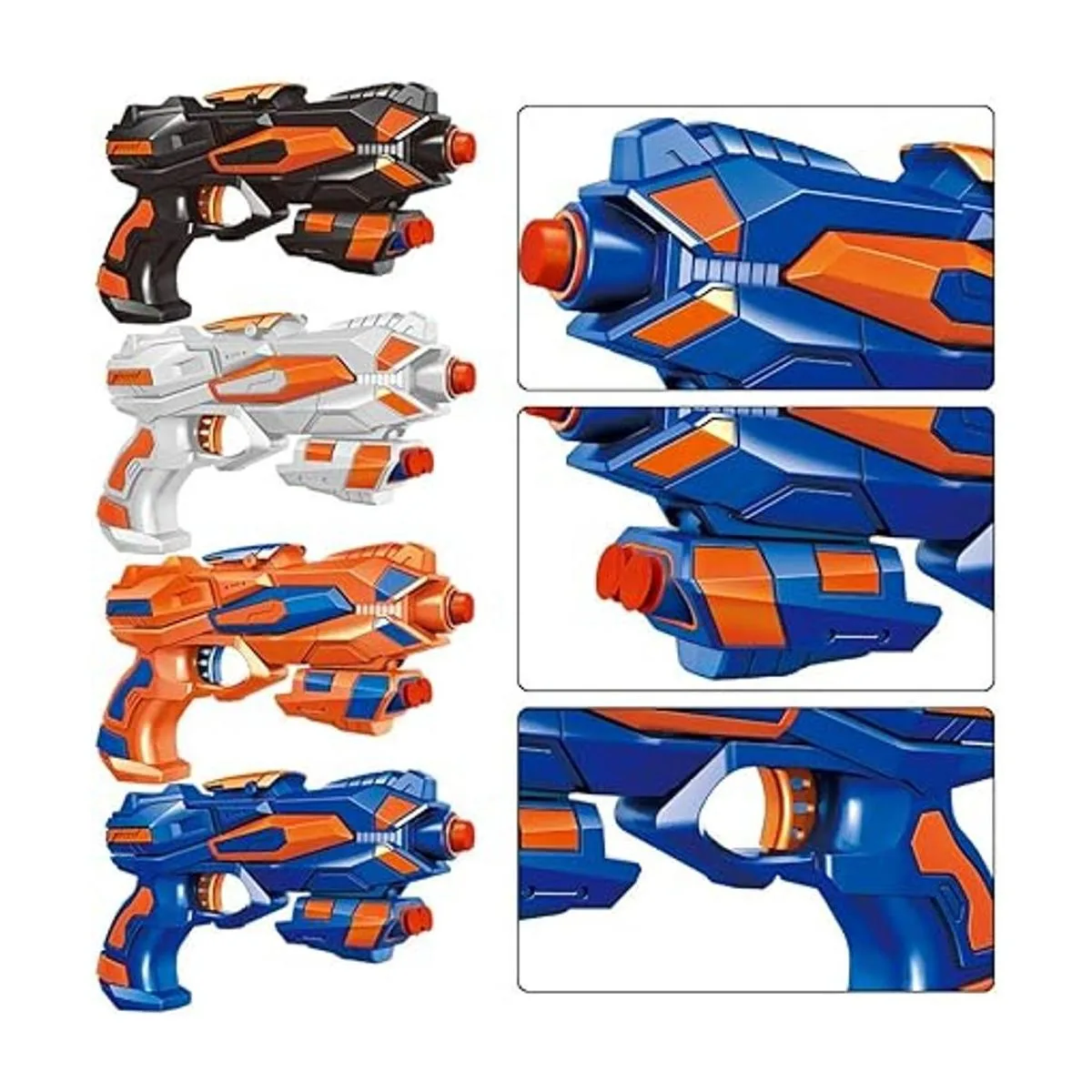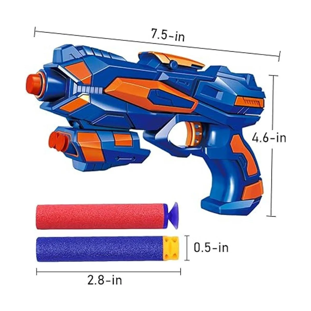 El paquete incluye: 4 s blaster con 80 dardos de bala de espuma suave. Dimensiones de las s Blaster: 7.5 x 4.6 pulgadas, adecuadas para niños mayores de 6 años, 3 a 6 años necesitan operar bajo la supervisión de un adulto, los adultos también pueden jugar.