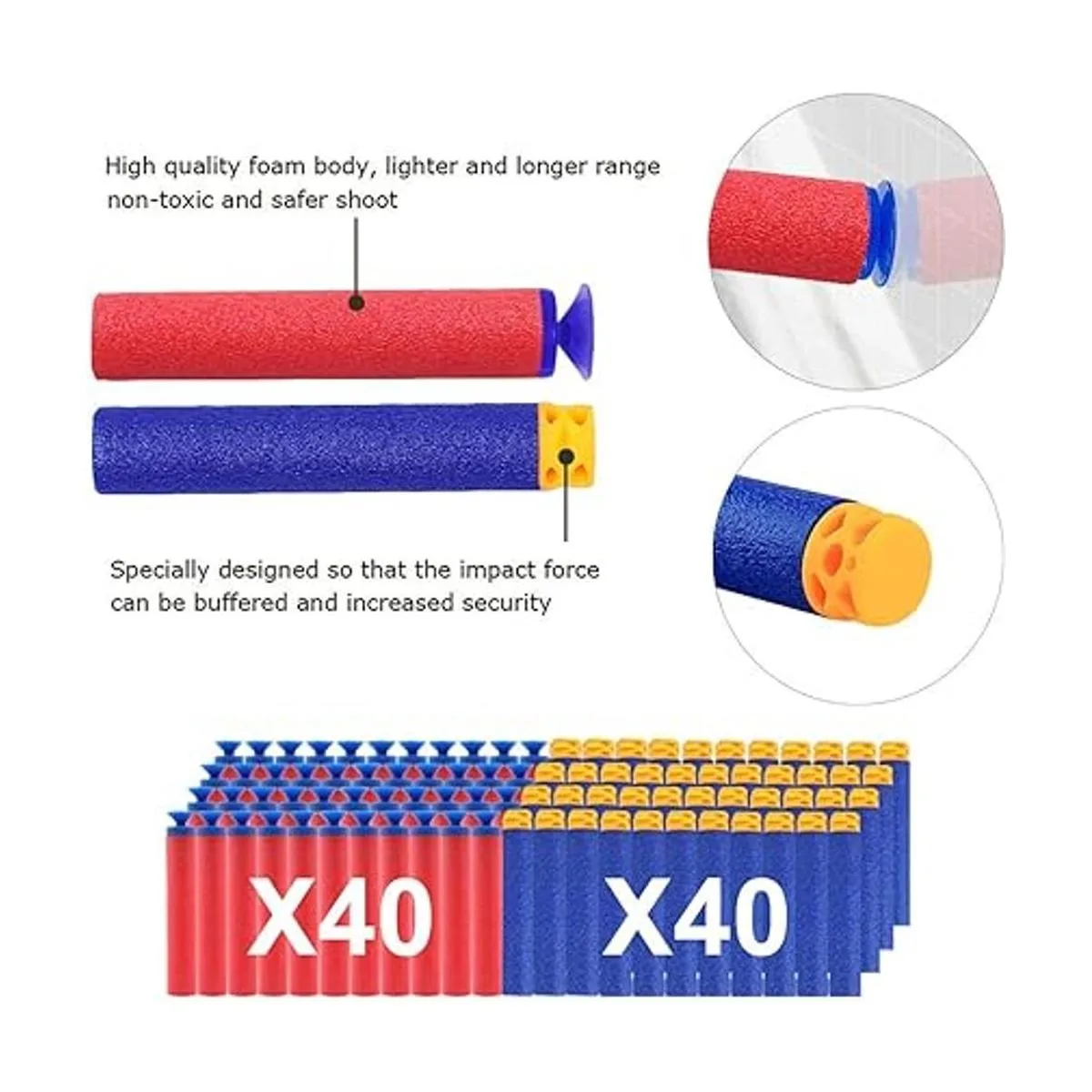 80 dardos de repuesto: 40 dardos se pueden fijar a la superficie lisa y 40 balas de espuma regulares para 2 equipos para usar, los dardos de recambio son de espuma suave, seguros para los niños pequeños.