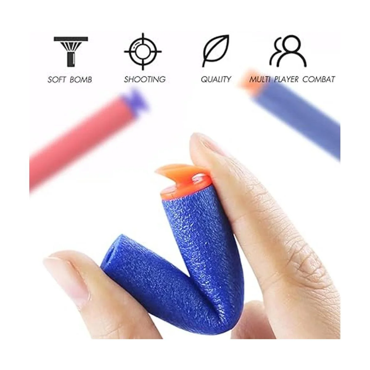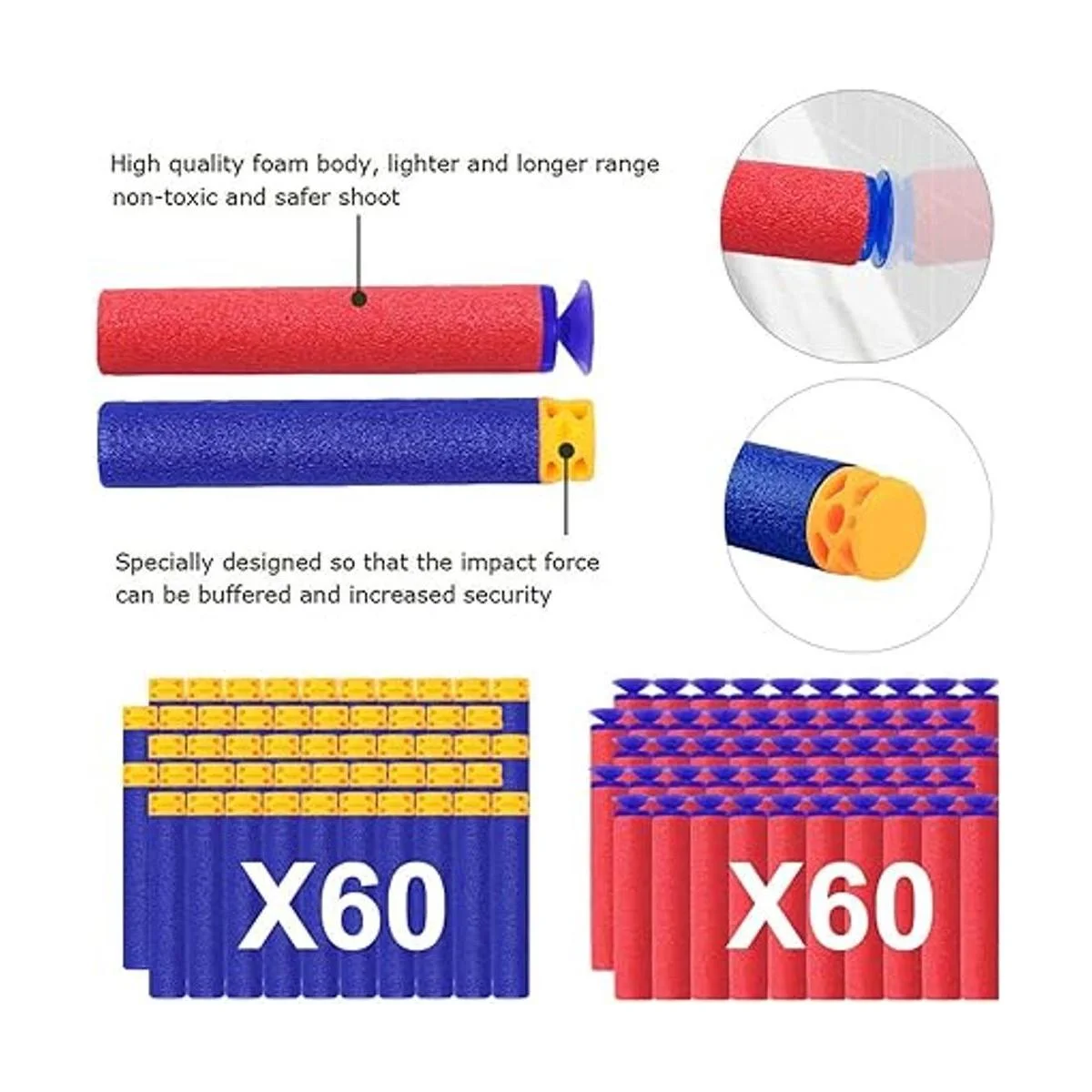 120 balas recargables: las balas de s de baster están hechas de espuma EVA de alta calidad. Tiene buena dureza y se puede utilizar repetidamente. La cabeza de bala roja adopta una ventosa, que se puede fijar a una superficie lisa al disparar.