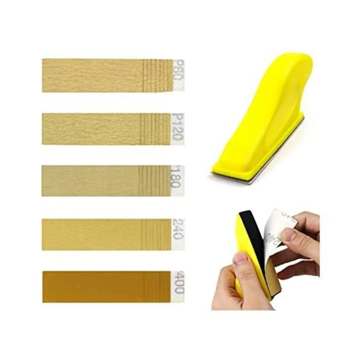 Contenido del paquete: 1 paquete de lijadora de detalles, 10 piezas de papel de lija de grano 80/120/180/240/400.