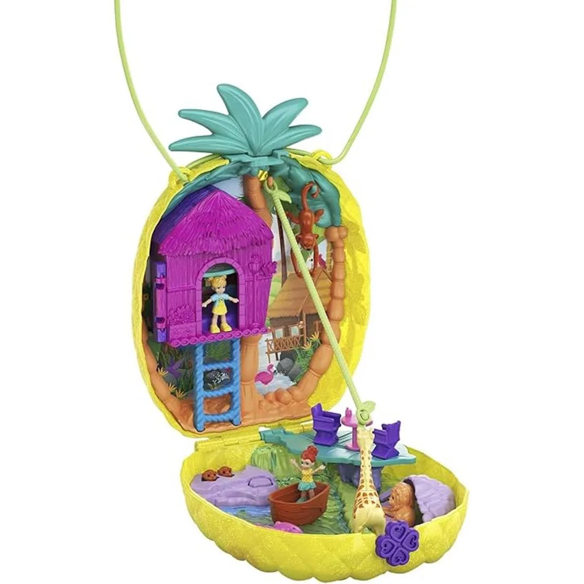 Este adorable bolso de piña Tropicool se abre a una emocionante aventura de safari con micro muñecas Polly y Lila, una figura de mono y barco que se adapta a 2 muñecas.