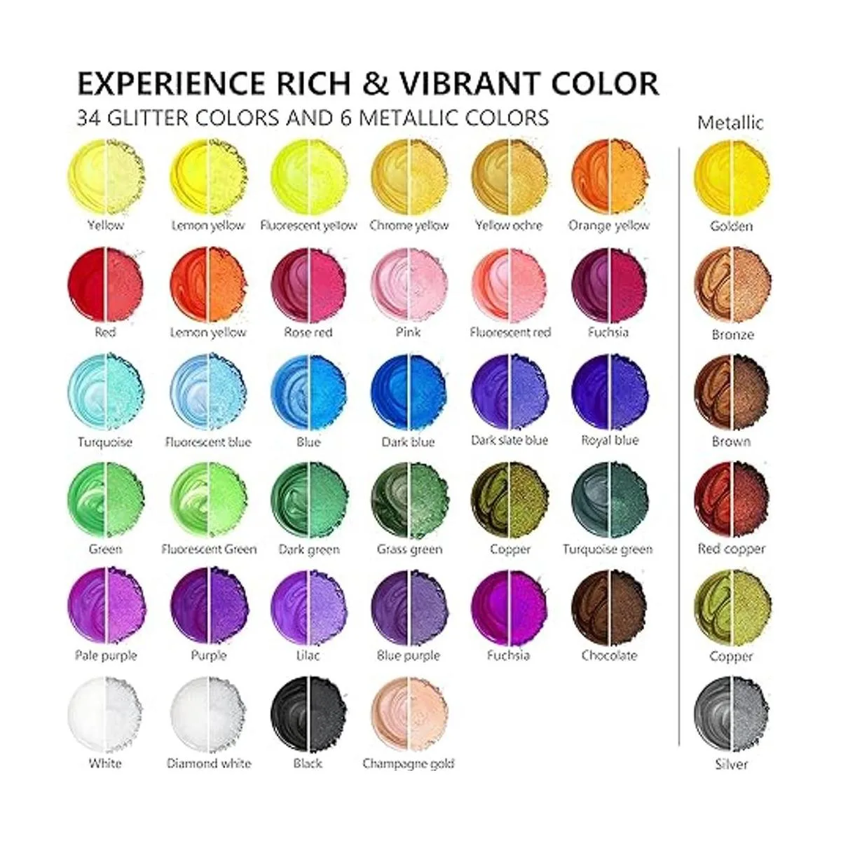 Opciones de flash brillantes: el polvo de mica ABOUTtiene 40 colores brillantes para elegir para hacer que tu proyecto sea realmente popular Hay 5 cucharas pequeñas y 1 cepillo en cada traje, lo que hace que tu proyecto sea más fácil, cada color está empaquetado en una botella de 0.18 onzas