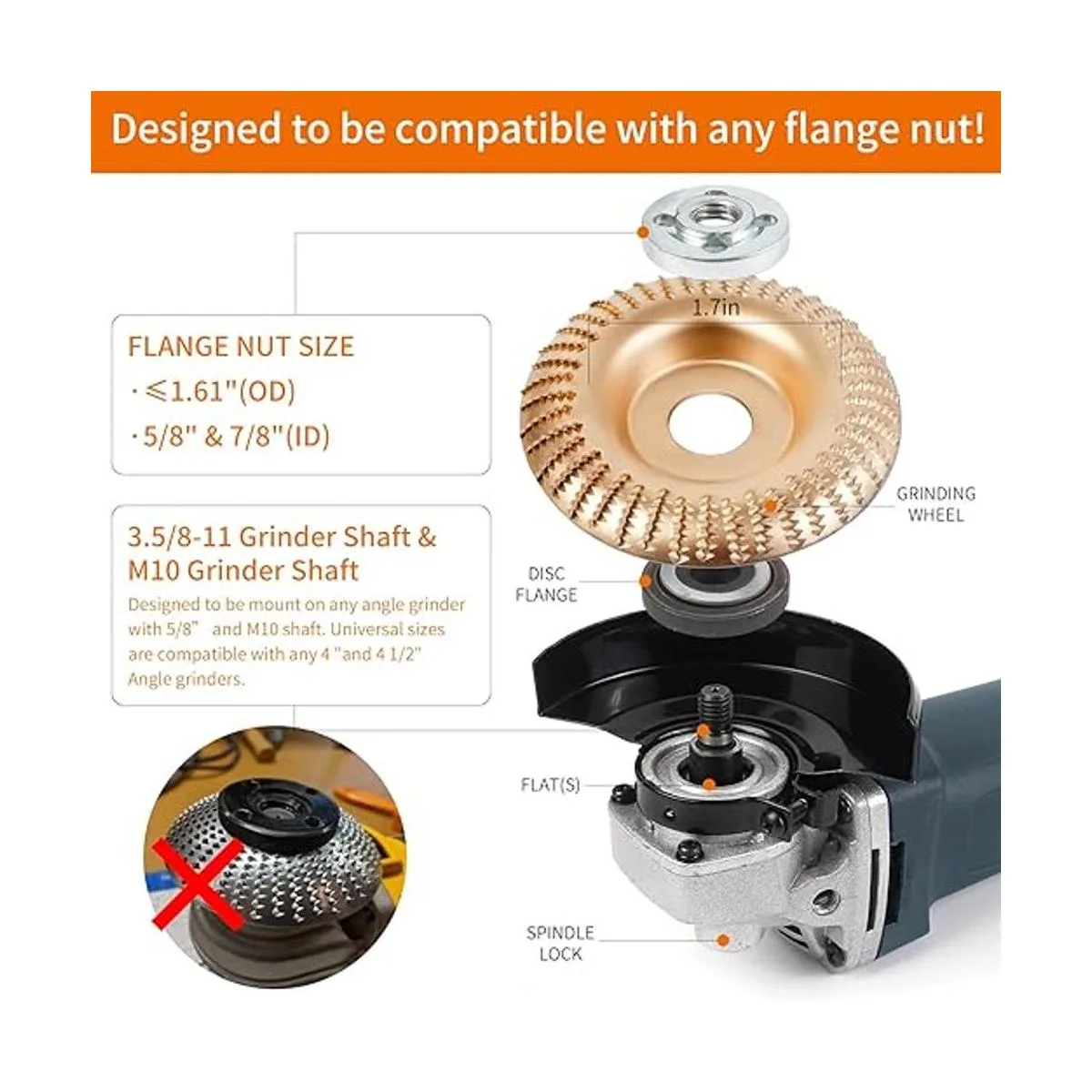Diseño mejorado: después de comprobar todas las quejas del juego de discos de molienda vendidos en , nuestro ingeniero actualizó el diámetro del agujero central para ser compatible con amoladora angular de 4 y 4 1/2 pulgadas. Las ranuras del disco de tallado de madera se han ampliado para adaptarse a tuercas de brida negras de 1.6 pulgadas ampliamente utilizadas. Así que todas las piezas funcionan directamente fuera de la caja.