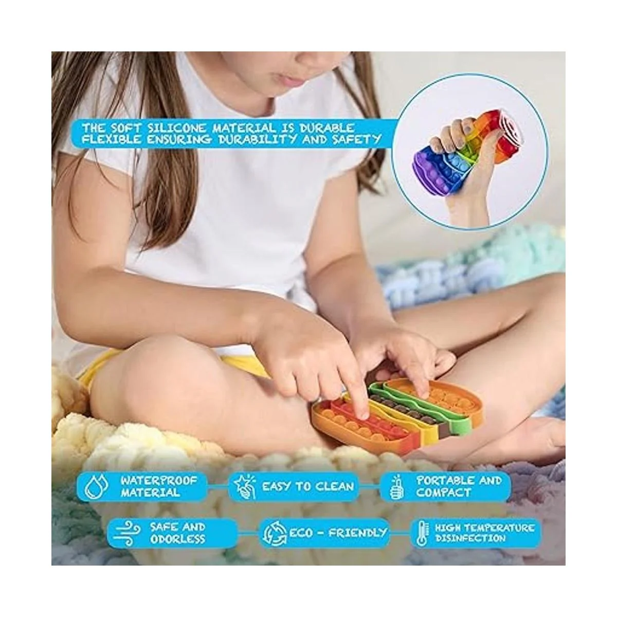 Ciclo de inquietud que nunca termina: los juguetes Pop its están hechos con material de silicona de grado alimenticio de alta calidad que proporciona una excelente flexibilidad y larga vida útil. Pop its pack es fácilmente lavable y infinitamente reutilizable que incluso después de un uso a largo plazo, la textura no se distorsiona y la vitalidad de su color no se desvanece