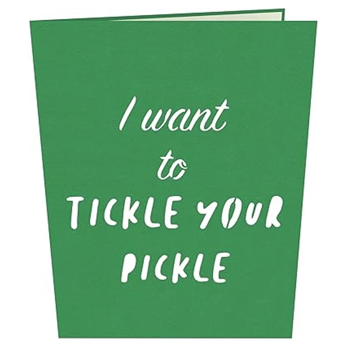 La escena: Cuando se abre, el gran miembro de gherkin verde tridimensional se despliega para sorprender al afortunado destinatario. Completa con la divertida frase I Want to Tickle your Pickle….Thats a Big Dill you have there Quiero hacerle cosquillas a tu pepinillo… Ese es un gran eneldo que tienes ahí, esta tarjeta es descarada e inolvidable Colorido y divertido, este popup invita al destinatario a abrirlo y a descubrir la sobresaliente sorpresa en el interior
