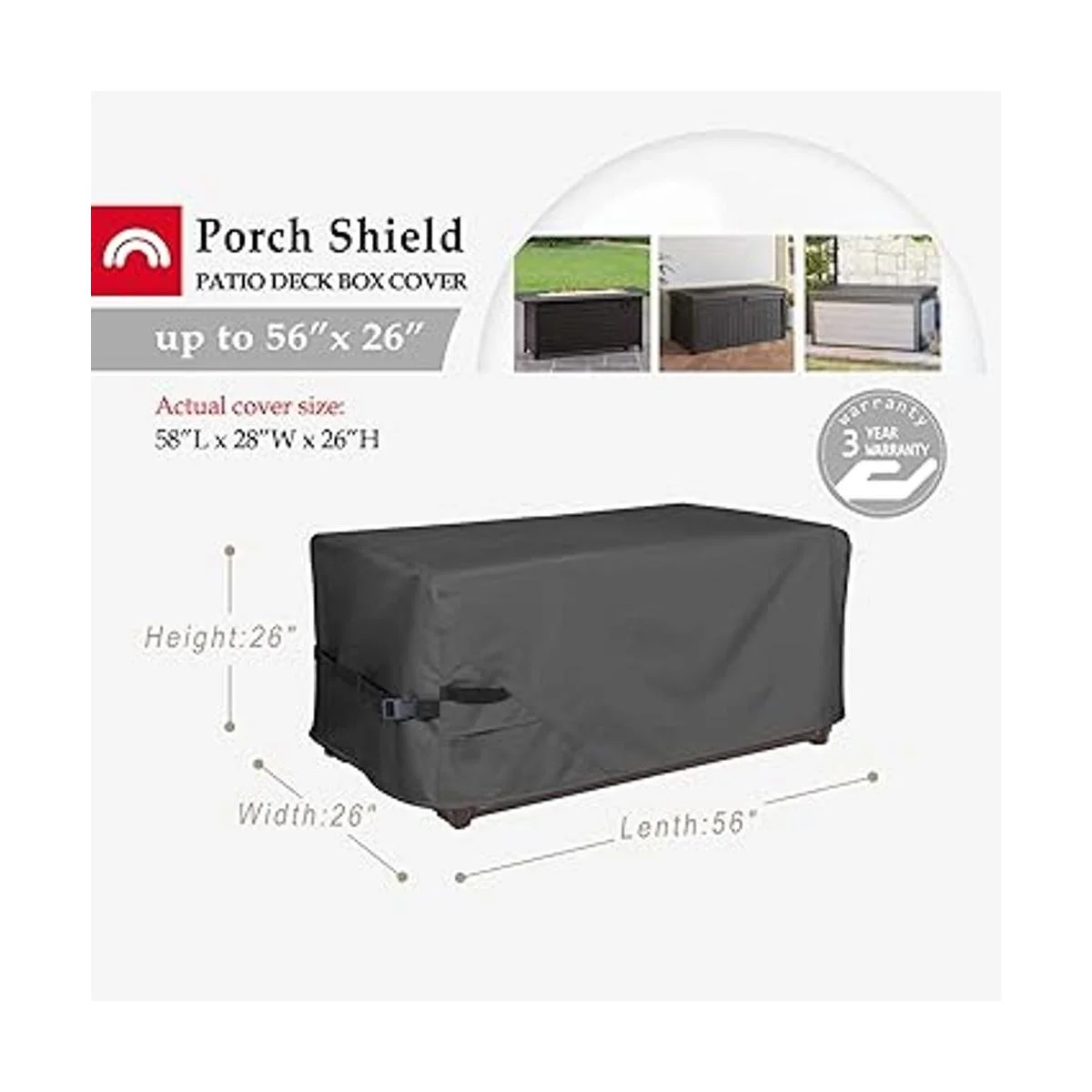 Dimensiones: la funda para caja de terraza de patio se adapta a cajas rectangulares de patio de hasta 56 pulgadas de largo x 26 pulgadas de ancho x 26 pulgadas de alto. Tamaño real de la cubierta: 58 pulgadas de largo x 28 pulgadas de ancho x 26 pulgadas de alto. Ofrecemos 3 años de garantía.