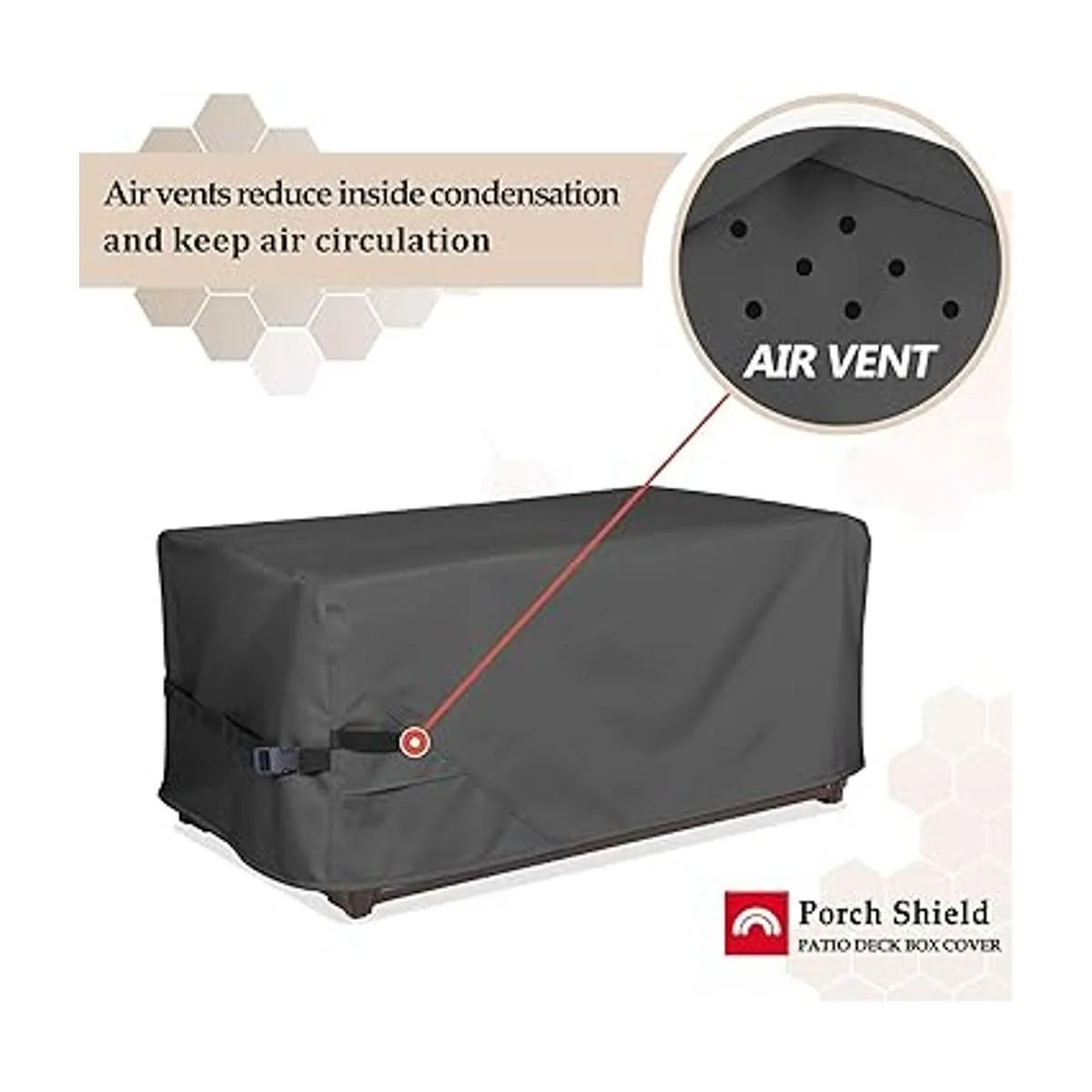 Material mejorado: si tienes un problema con que tu caja de terraza de patio se moje y se ensucie, la cubierta de almacenamiento de caja de patio Porch Shield es una gran alternativa. Está hecha de tela de poliéster 600D con revestimiento inferior impermeable. Dale a tu caja de terraza al aire libre protección contra el sol, la lluvia, la nieve, el viento, el polvo y la suciedad.