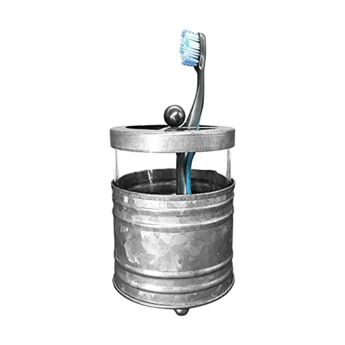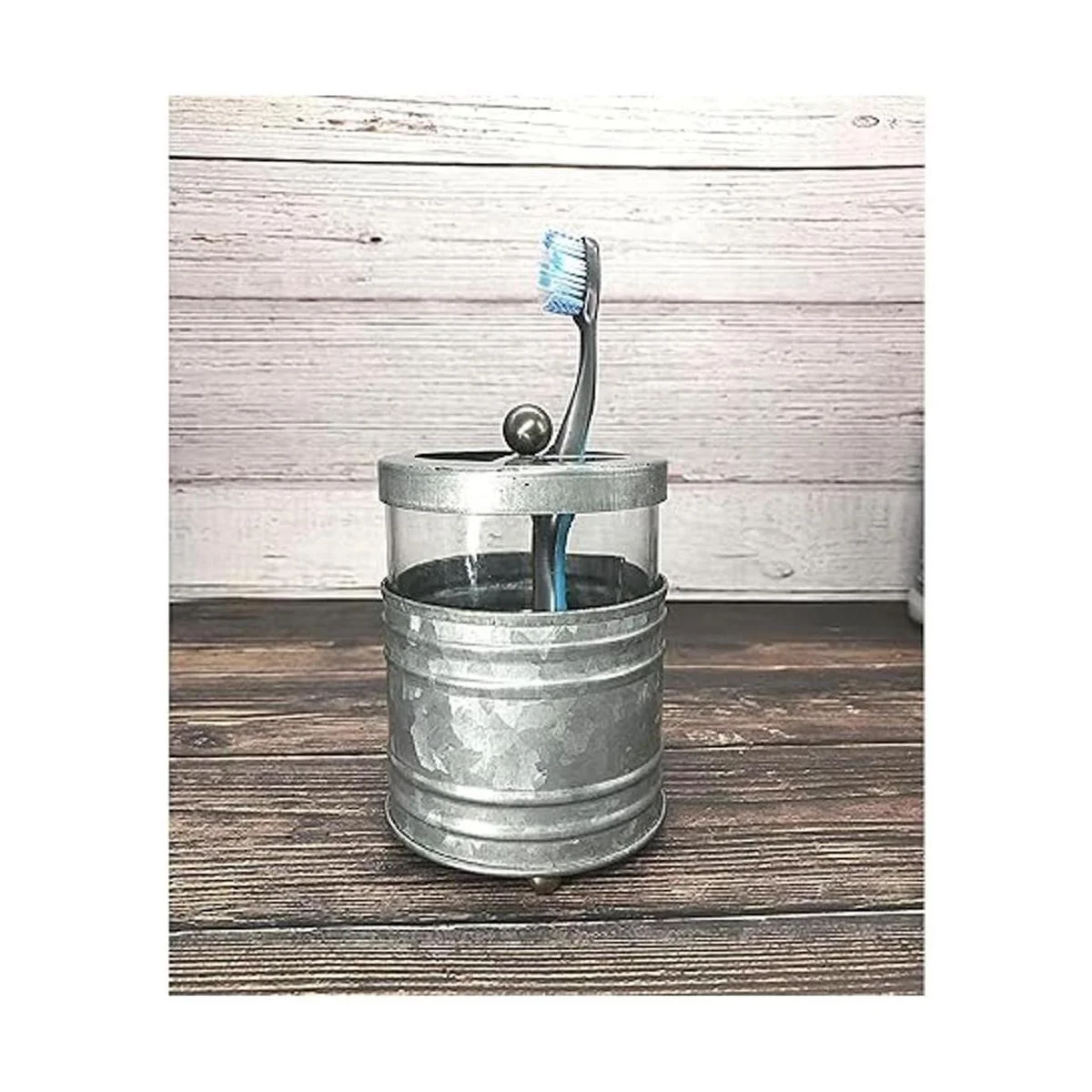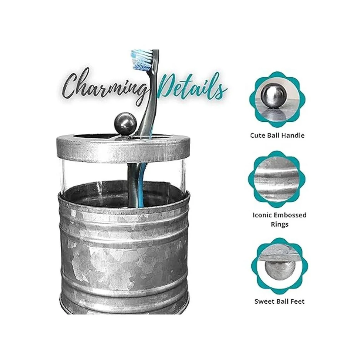 Porta cepillo de dientes rústico de vidrio y metal galvanizado Soporte de cepillo de dientes de granja para cuarto de baño Encantador organizador de vanidad para su decoración de baño de granja galvanizada