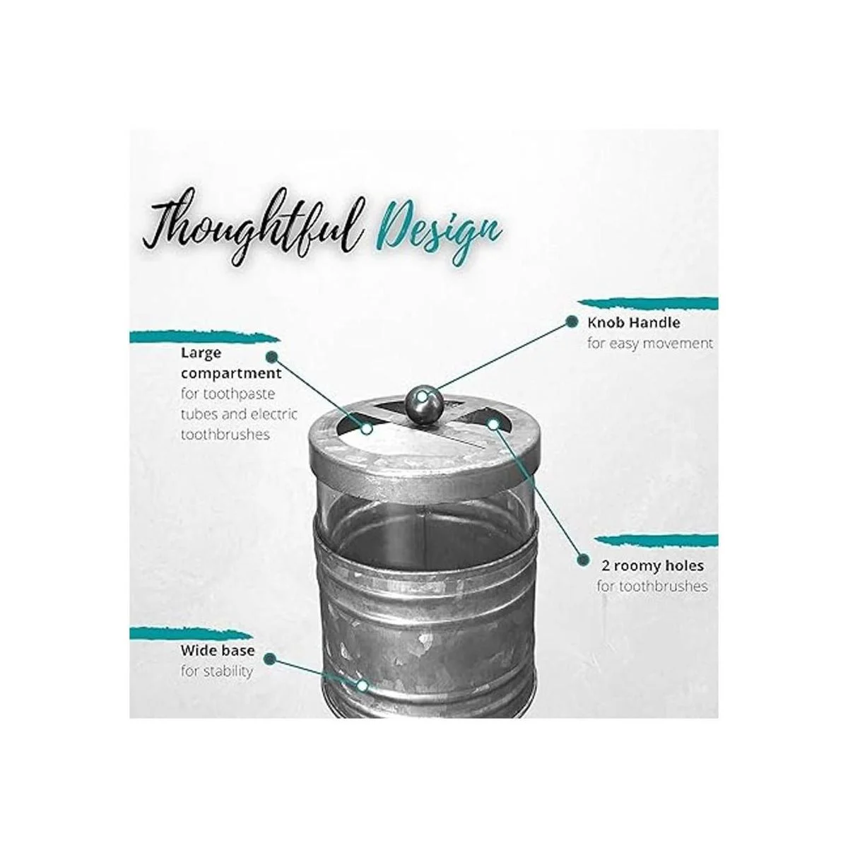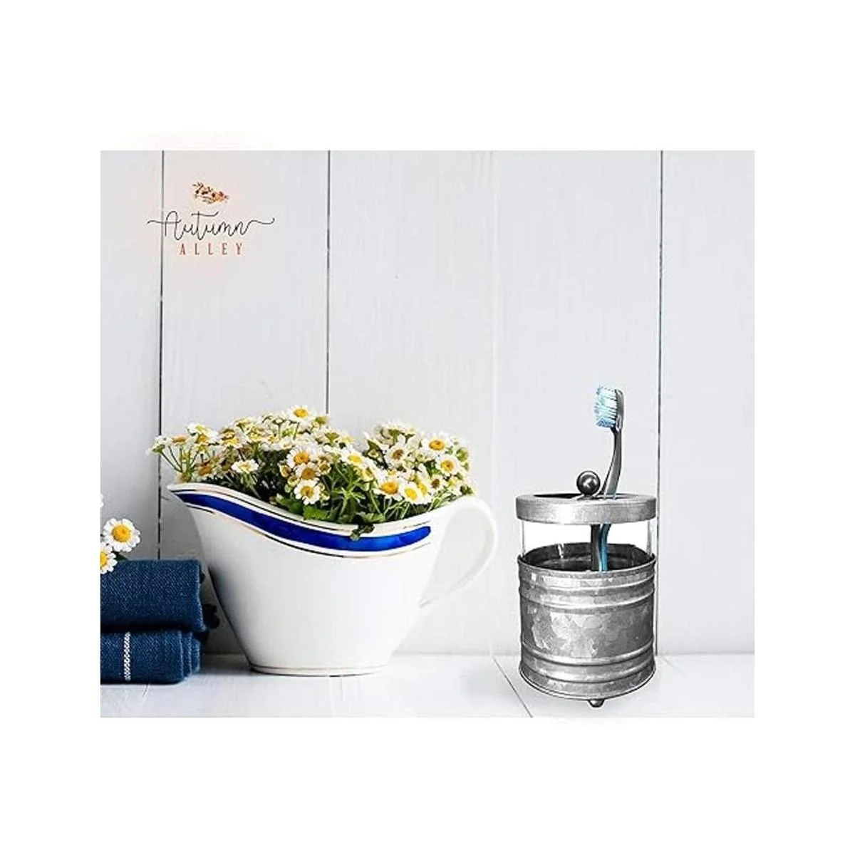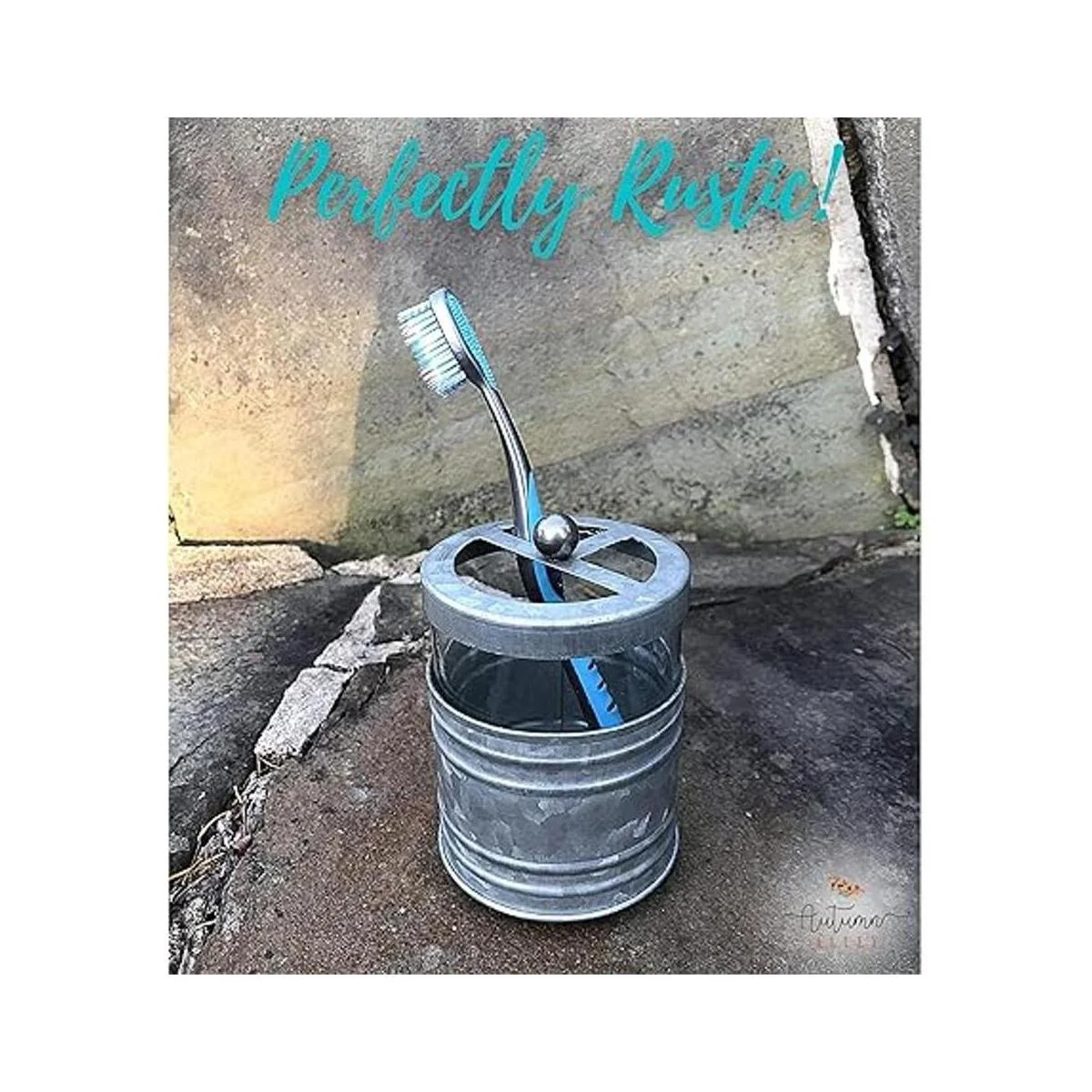 Porta cepillo de dientes rústico de vidrio y metal galvanizado Soporte de cepillo de dientes de granja para cuarto de baño Encantador organizador de vanidad para su decoración de baño de granja galvanizada
