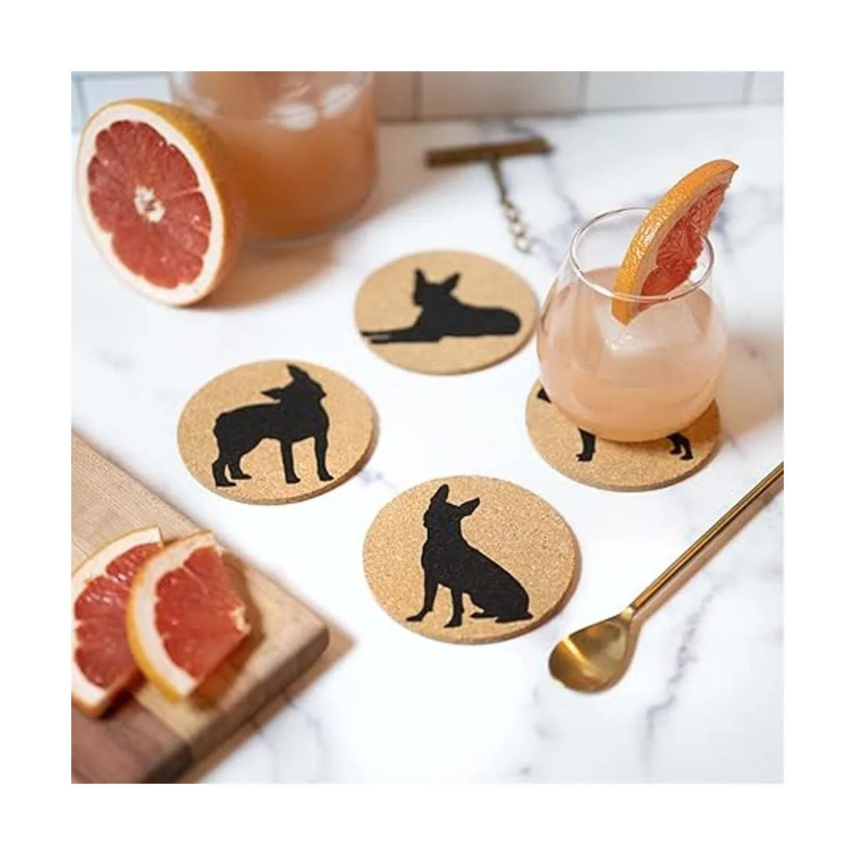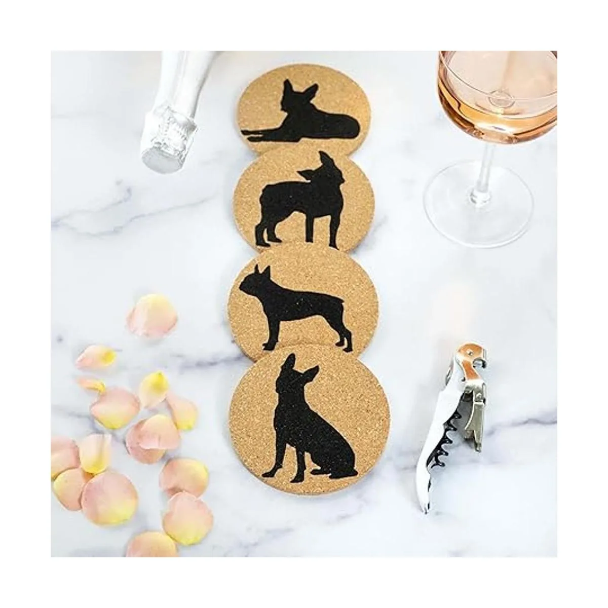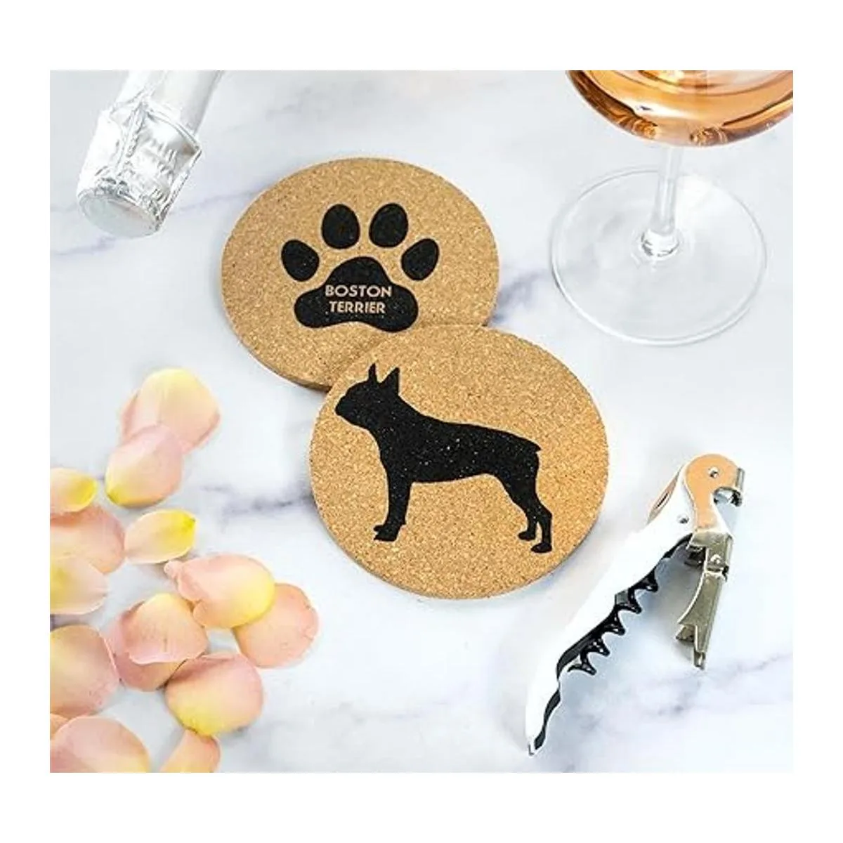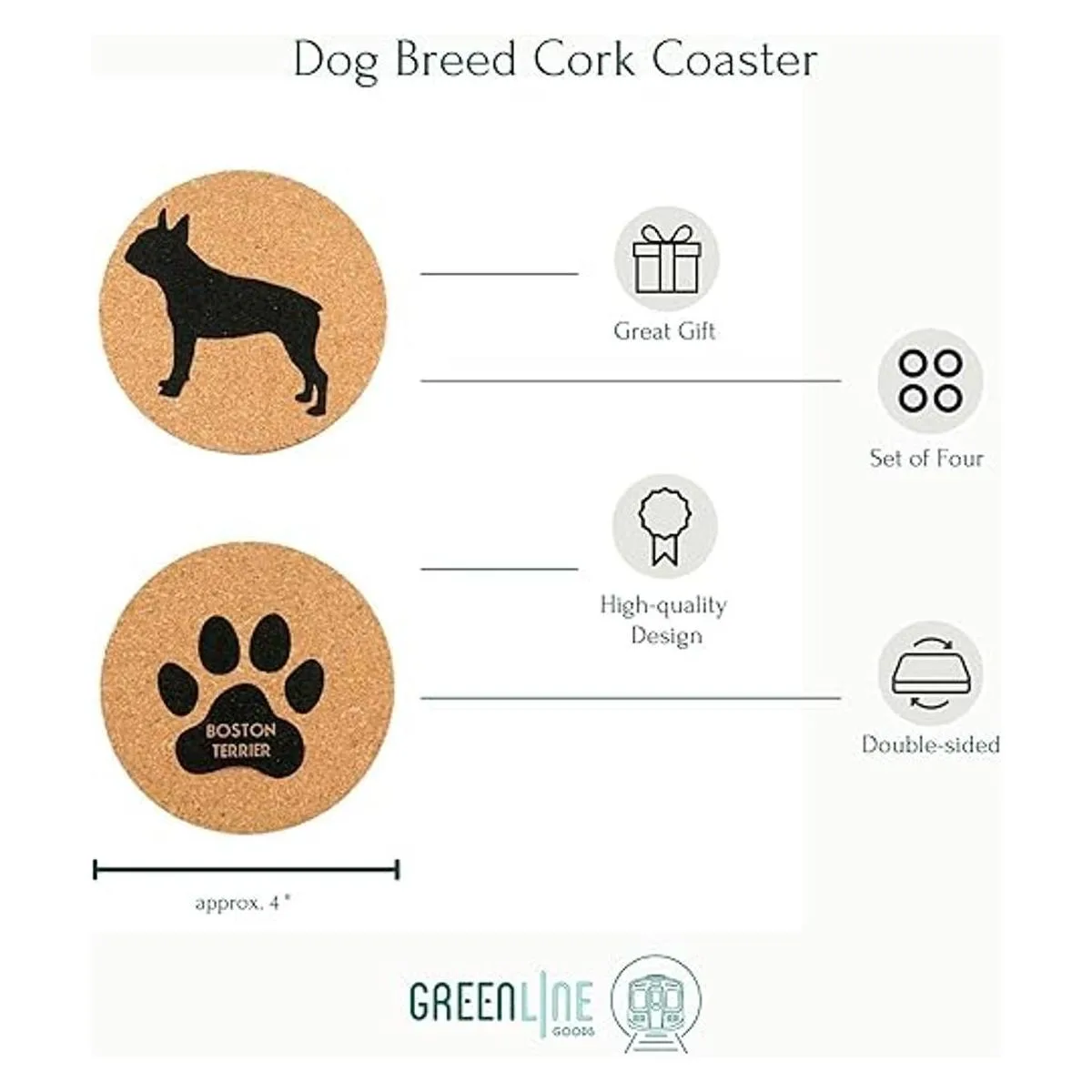 Celebra tu raza favorita: un clásico posavasos de corcho con el Boston Terrier en 4 posturas. 4 pies de diámetro, pulgadas de grosor, cada posavasos incluye una parte inferior de corcho para proteger tu mesa de café y superficies de hogar u oficina de anillos de humedad, líquidos derramados o arañazos de tus tazas y vasos.