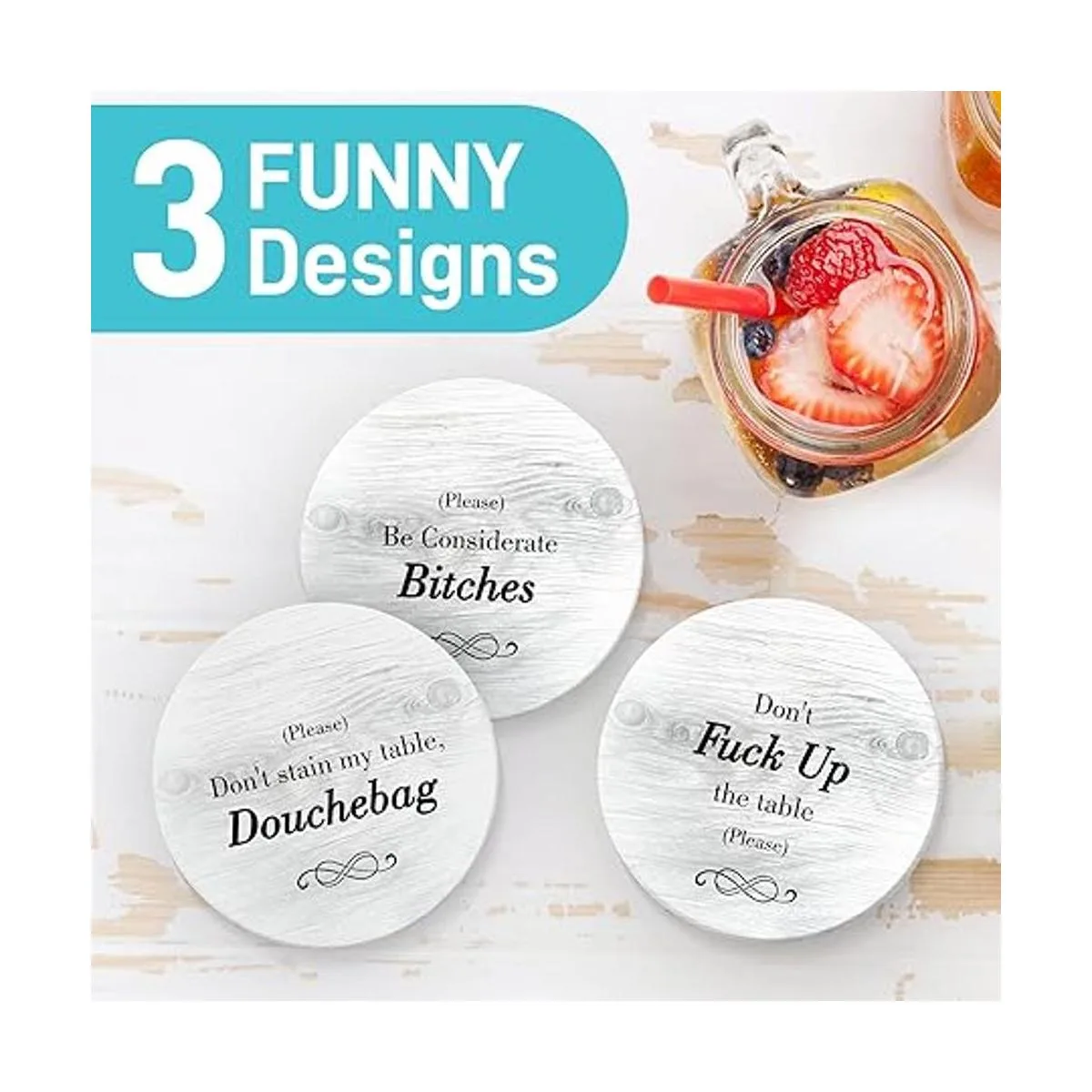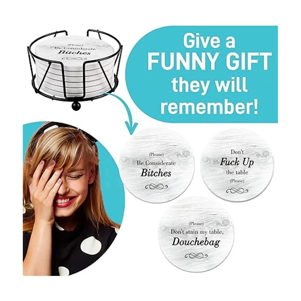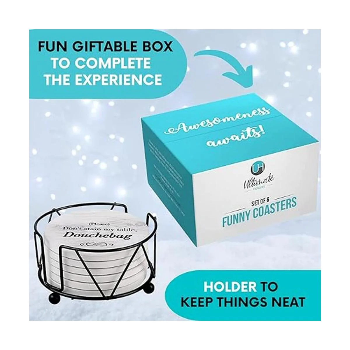 Posavasos divertidos para bebidas absorbentes con soporte, 6 piezas, juego de regalo novedoso, 3 diferentes leyendas regalo único para amigos, hombres, mujeres, inauguración de la casa, cumpleaños, elefante blanco, o fiesta de vacaciones.