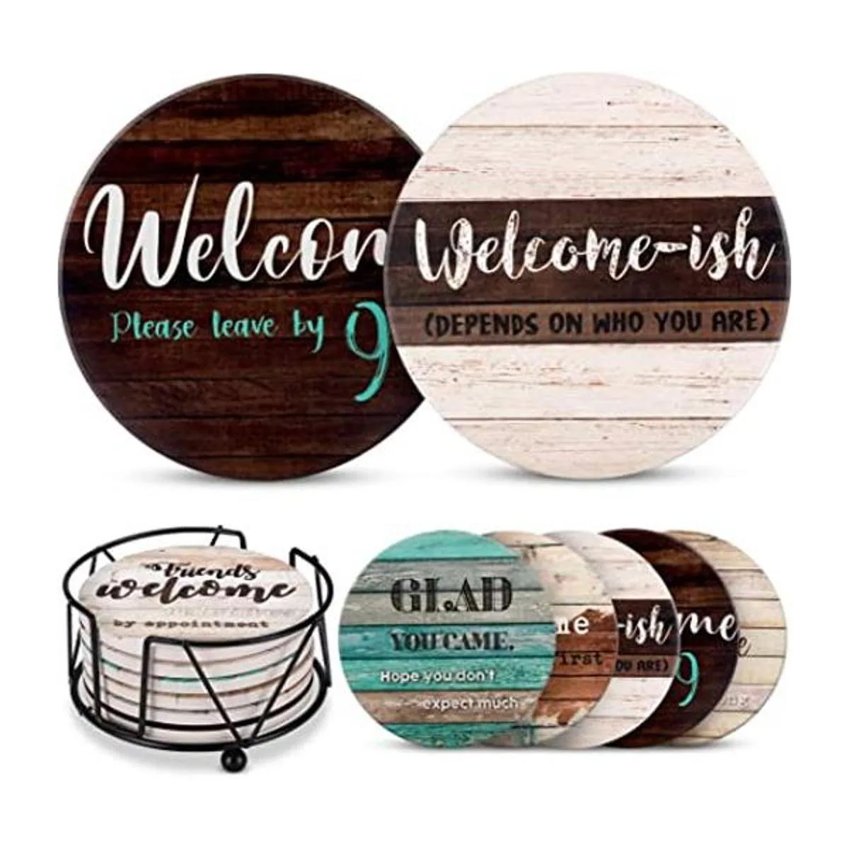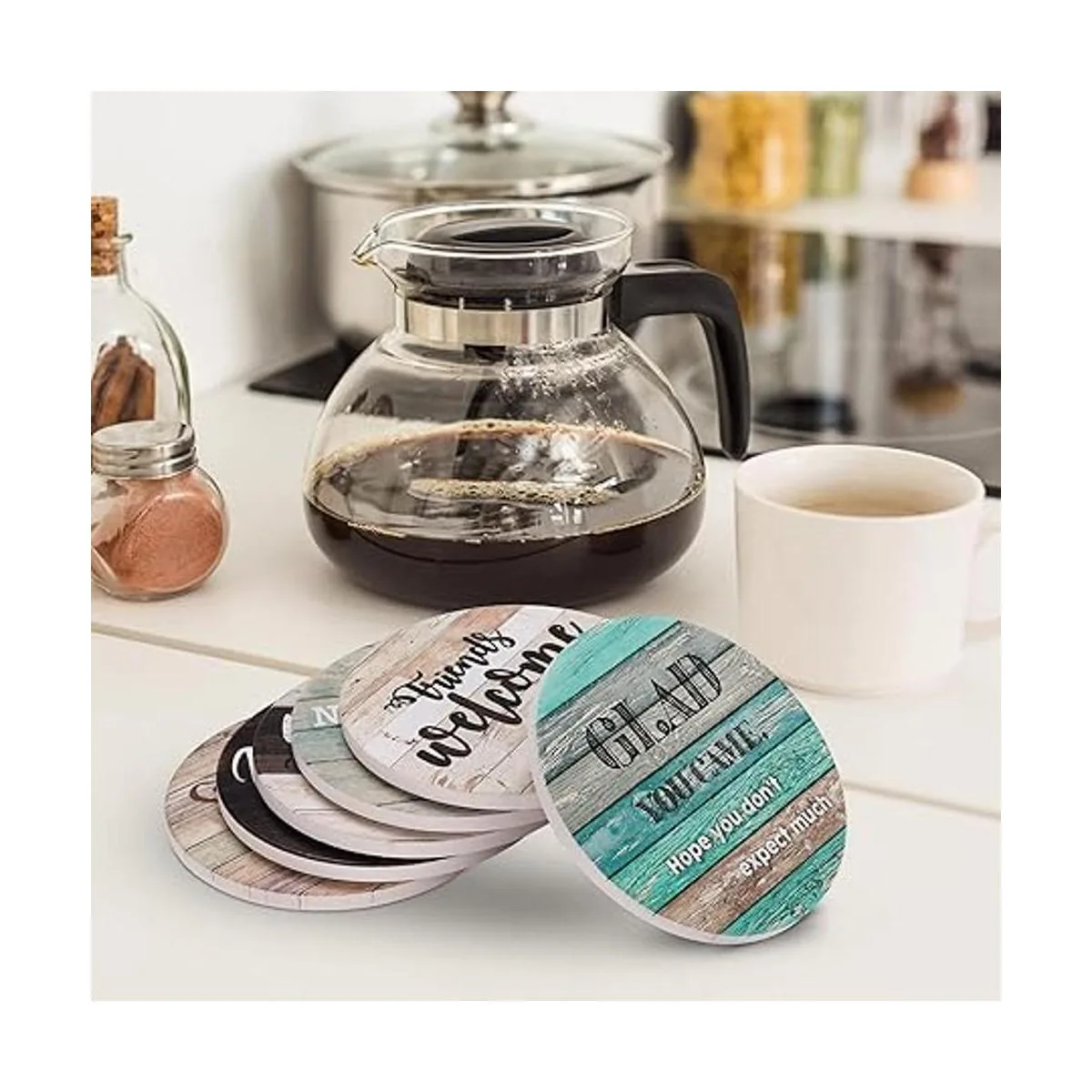 Posavasos divertidos para mesa de café, 6 posavasos de piedra absorbente sarcástica, posavasos de bar de granja para bebidas con soporte, regalo genial de inauguración de la casa, costador de tazas para mesa de madera
