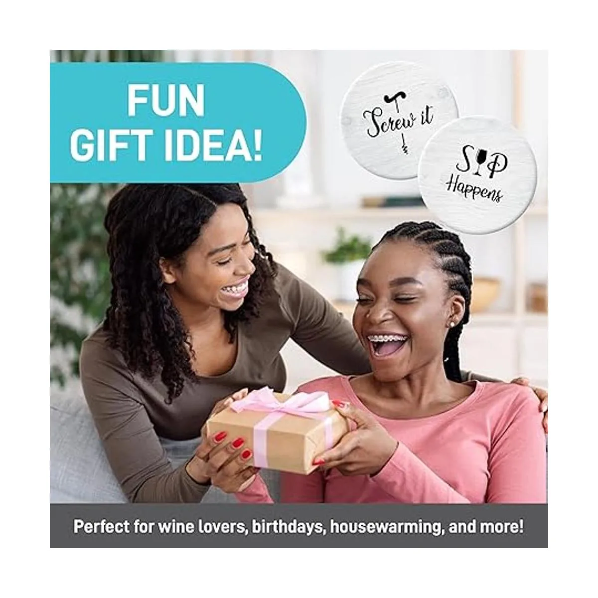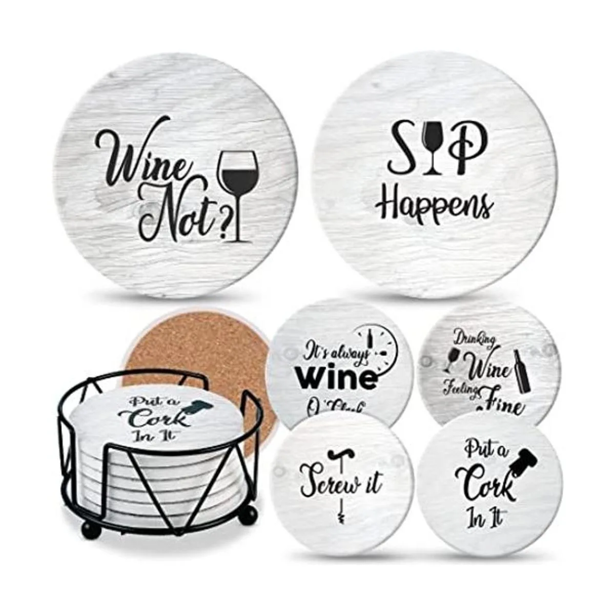 Posavasos para absorbentes de bebidas con soporte, 6 piezas de regalo con 6 dichos divertidos para los amantes del vino, piedra de cerámica con parte trasera de corcho, regalo único para inauguración de la casa, decoración de la sala de estar