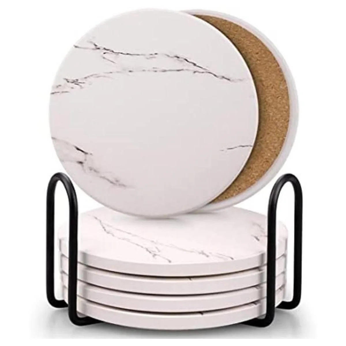 Posavasos para bebidas, juego de 6 posavasos de piedra de cerámica absorbente con soporte de metal, base de corcho, patrón de superficie de mármol, tazas para decoración del hogar, color blanco