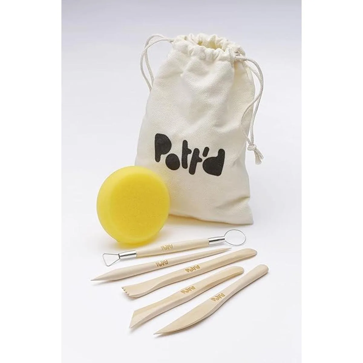 Artesanía: 5 herramientas de escultura de arcilla de madera y esponja alisadora vienen empaquetadas en una bolsa de herramientas de tela reutilizable, lo que te da todo lo que necesitas para cortar, tallar, suavizar y crear tu pieza perfecta. También incluimos nuestra guía especial de inicio rápido Pottd con 4 instrucciones únicas para crear tus piezas favoritas, además de mucha inspiración