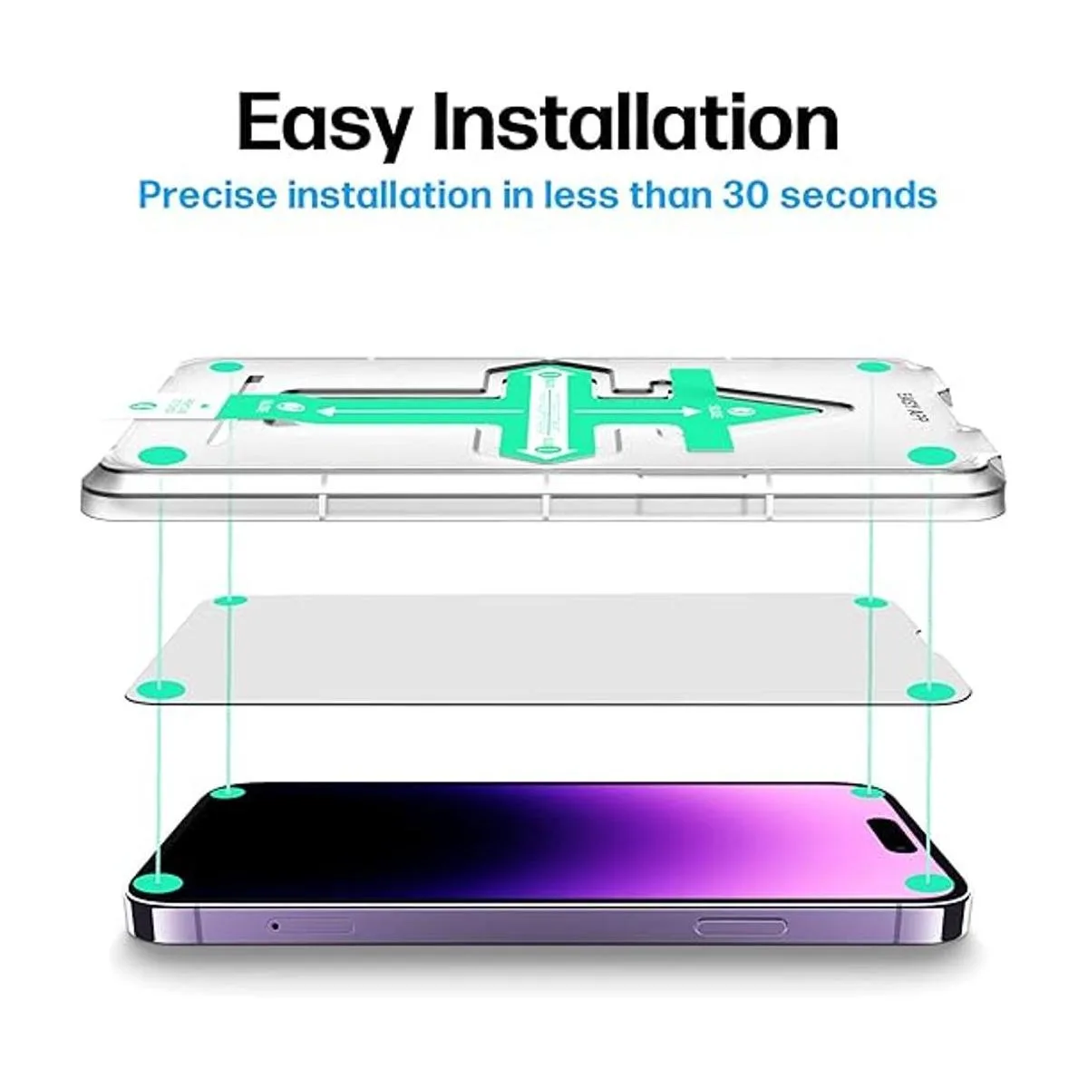 Instalación de 30 segundos, sin burbujas: nuestra innovadora bandeja fácil de instalar garantiza que tendrás una instalación rápida, precisa y sin burbujas. Para aplicar, simplemente retira el adhesivo de la bandeja aplicadora precargada, alinea con tu iPhone y presiona firmemente.