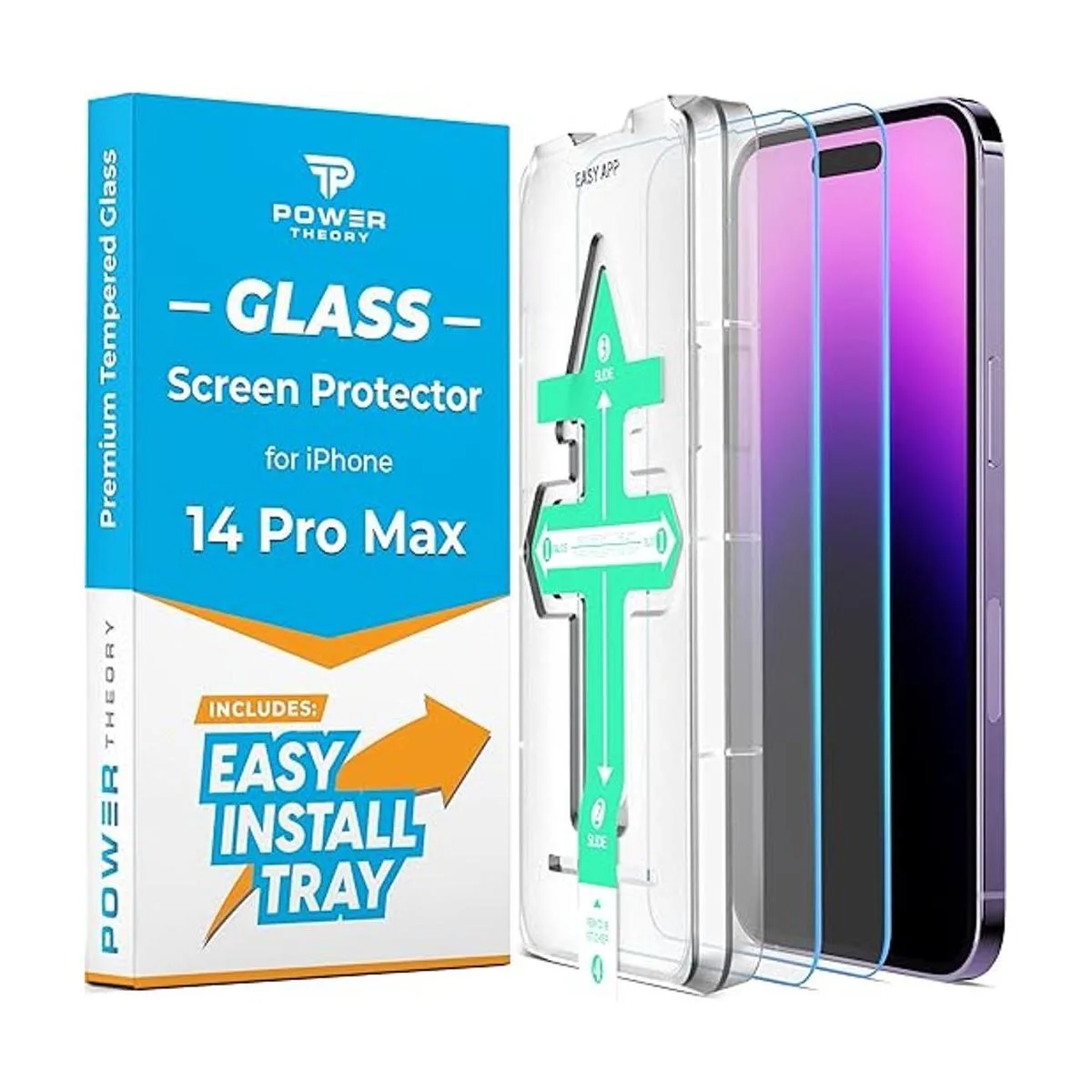 Power Theory Protector de pantalla de vidrio templado diseñado para iPhone 14 Pro Max, incluye bandeja de fácil instalación compatible con fundas protección del sensor, paquete de 2