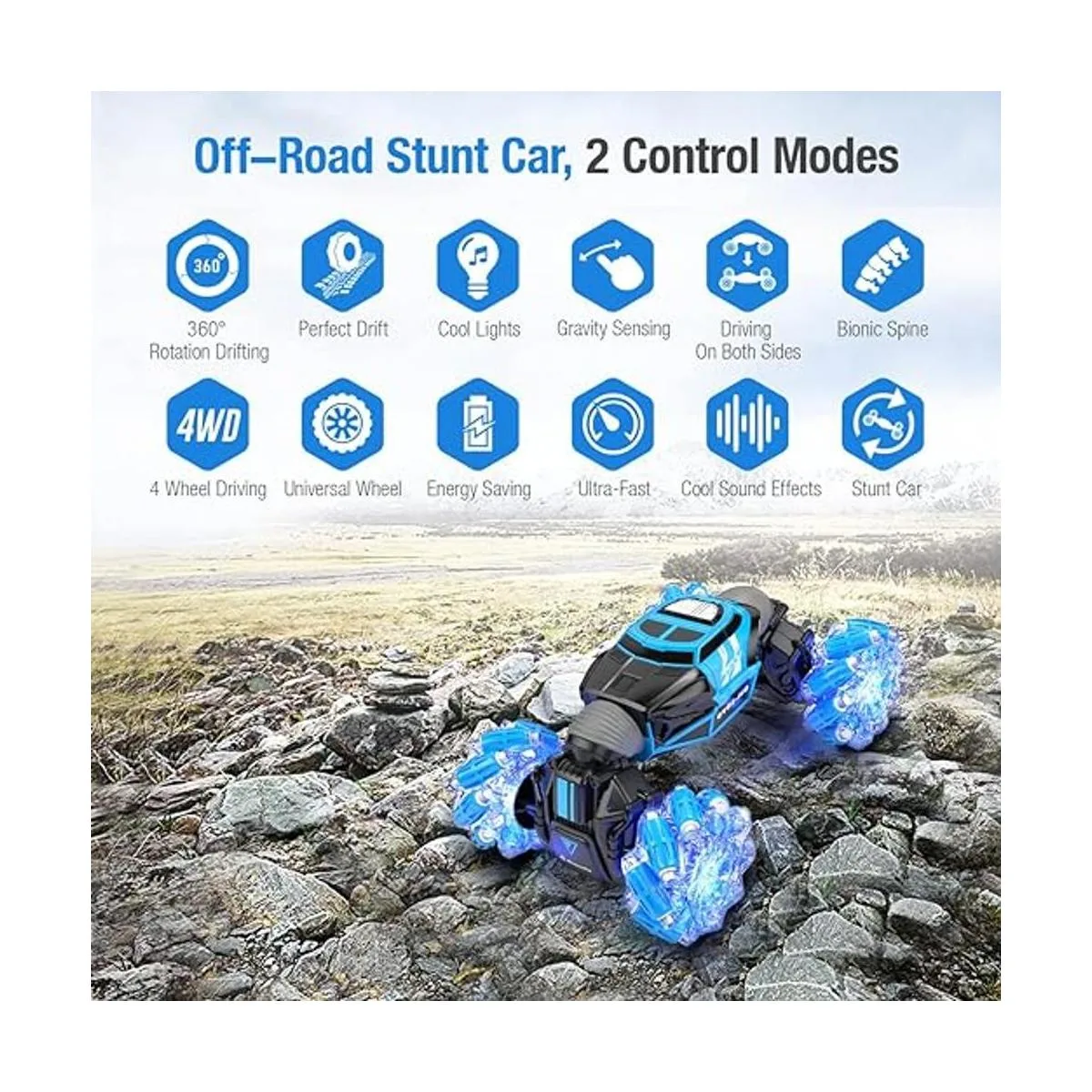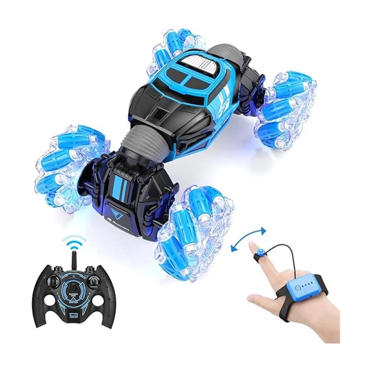 Powerextra Coche de acrobacias a control remoto 4WD 2.4 GHz con sensor de gestos de control remoto, vehículo todoterreno giratorio de doble cara con giros de 360 con luces de música, reloj de coches de juguete para niños y niñas cumpleaños