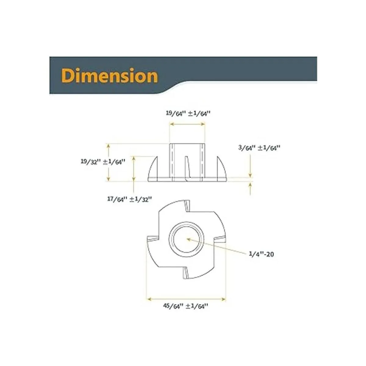 Dimensiones: Tamaño de la rosca: 1/4 pulgadas UNC20, troquel de brida: 23/32 pulgadas, altura del barril: 19/32 pulgadas, altura de la punta: 17/64 pulgadas, tamaño del taladro: 5/16 pulgadas