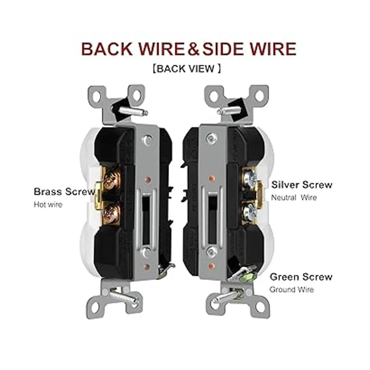 Fácil instalación Diseñado para empujar rápidamente el alambre y el alambre lateral. Orejas de yeso para una mejor alineación al ras Las pestañas de rotura permiten una fácil conversión de dos circuitos. Las dimensiones poco profundas permiten el máximo espacio de cableado en la caja de conexiones con otros enchufes e interruptores. Un clip de conexión a tierra facilita la instalación en una caja.
