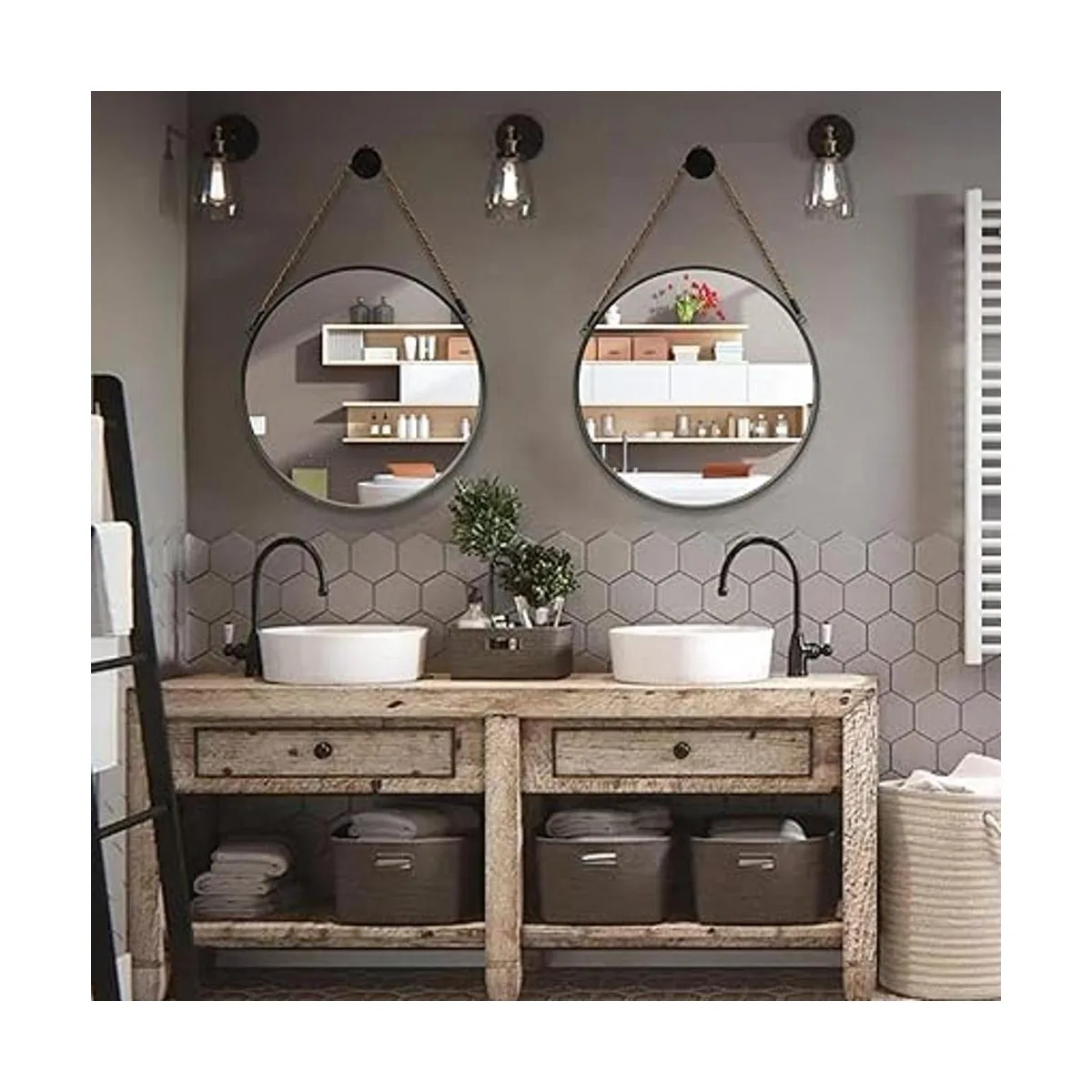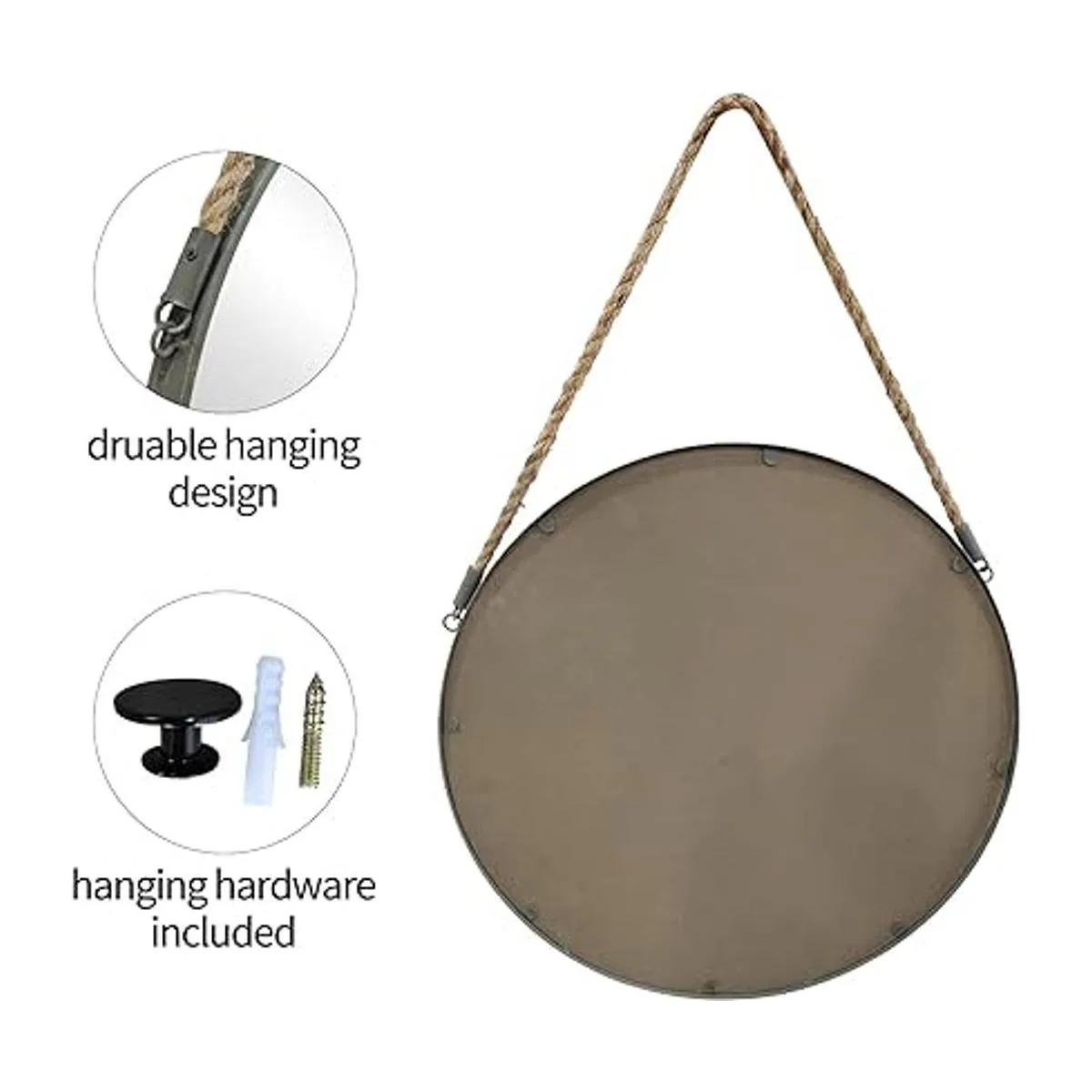 Espejo de alta calidad, marco de metal duradero con acabado de superficie mate, espejo circular HD, cuerda de lino retro, adecuado para granja, baño y sala de estar. estará contigo durante mucho tiempo.