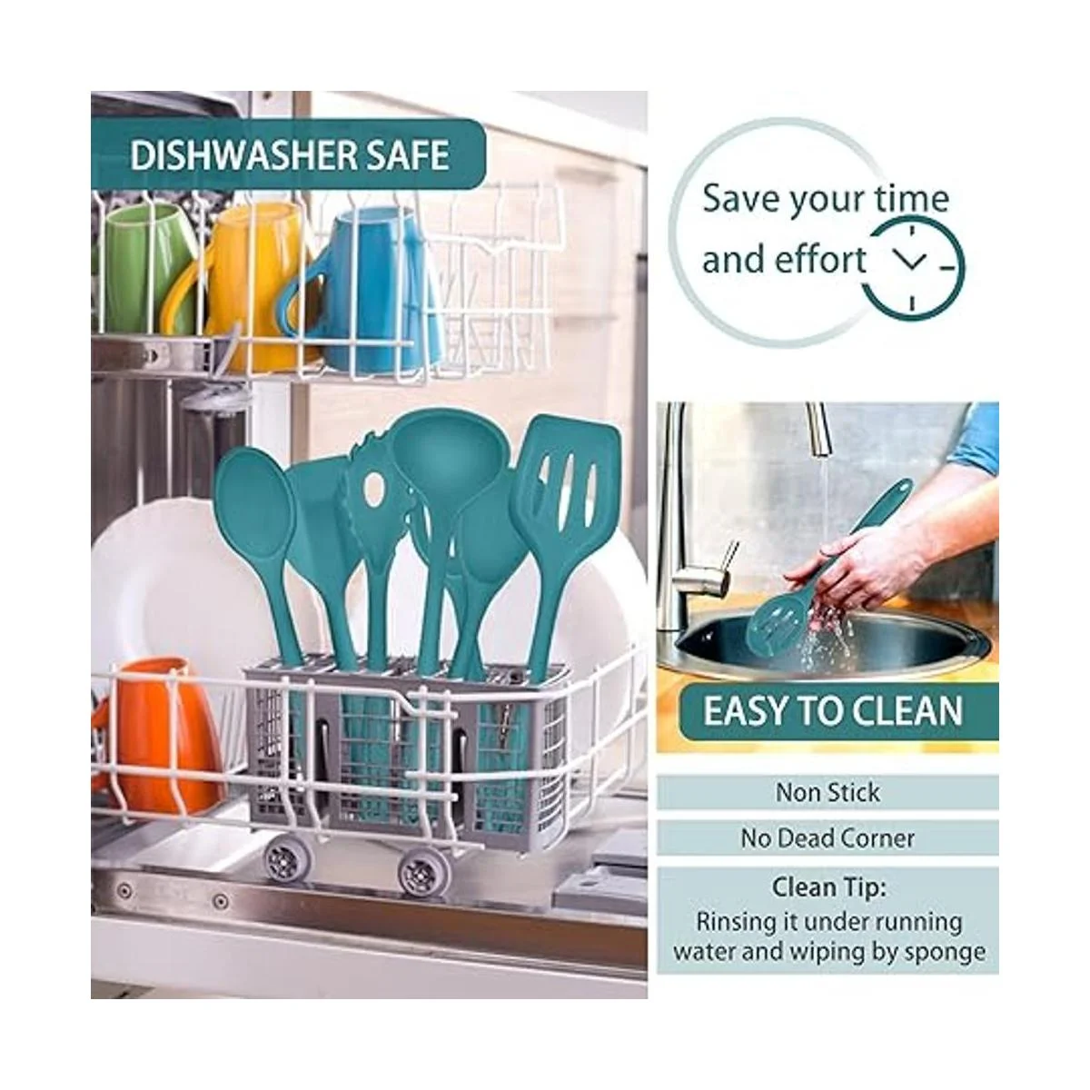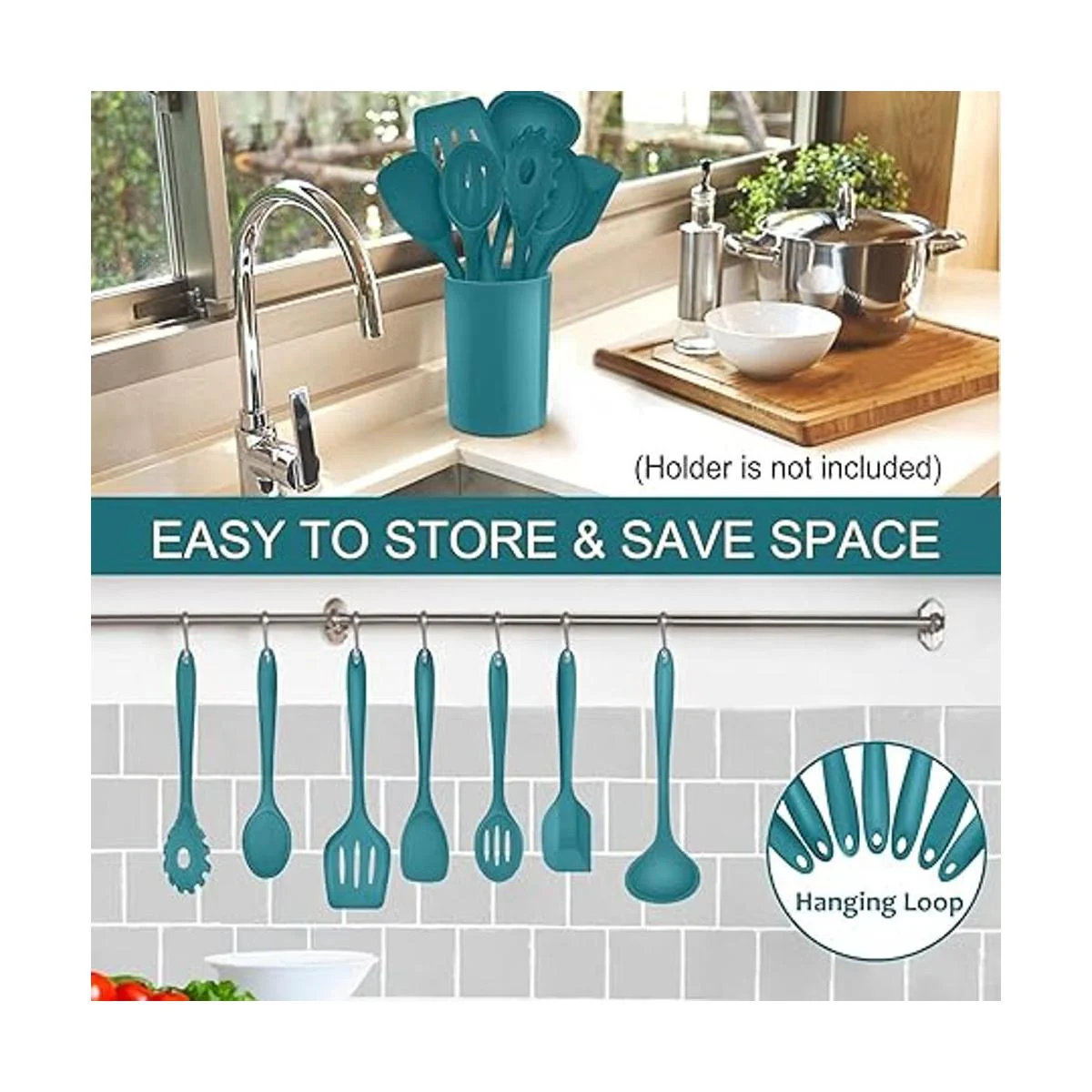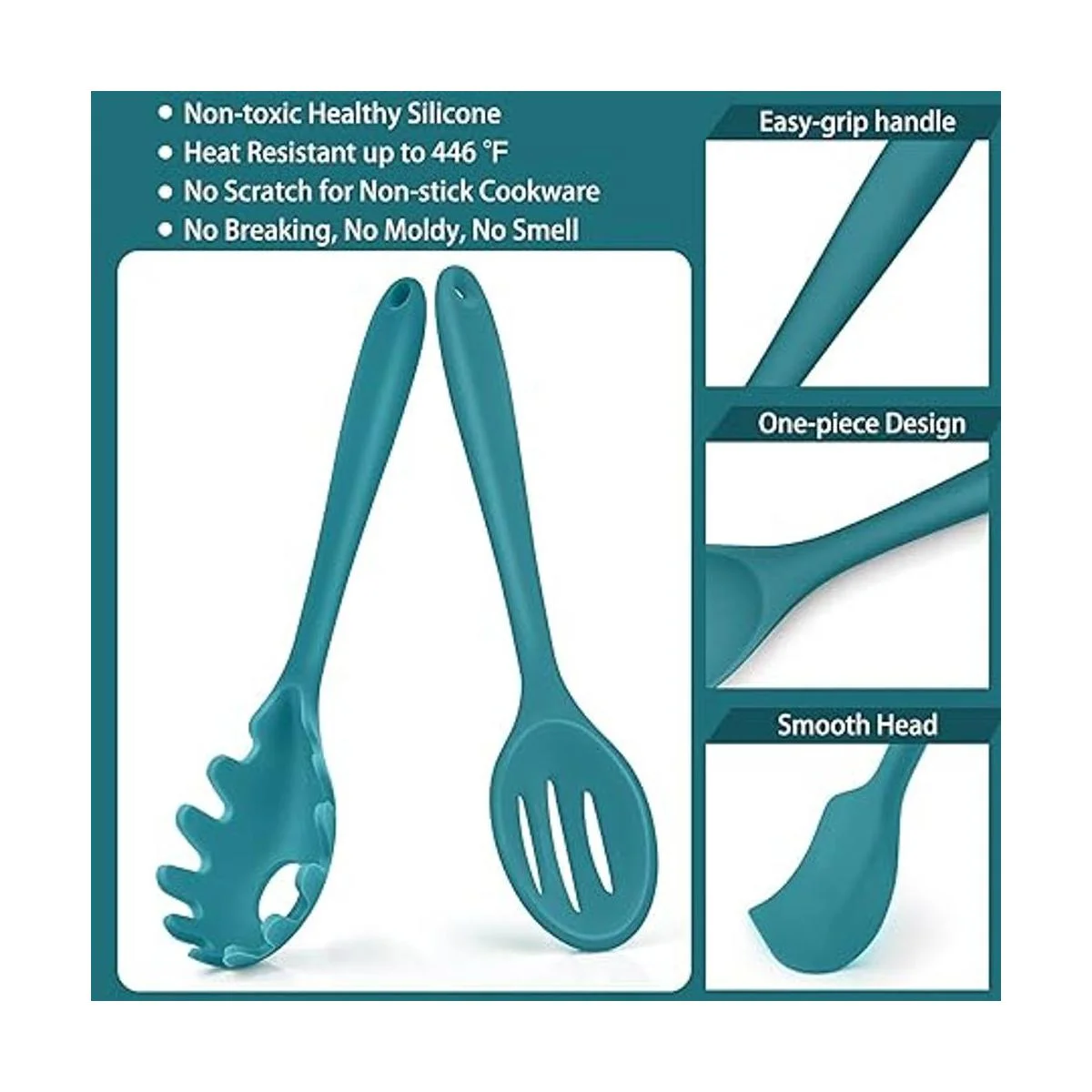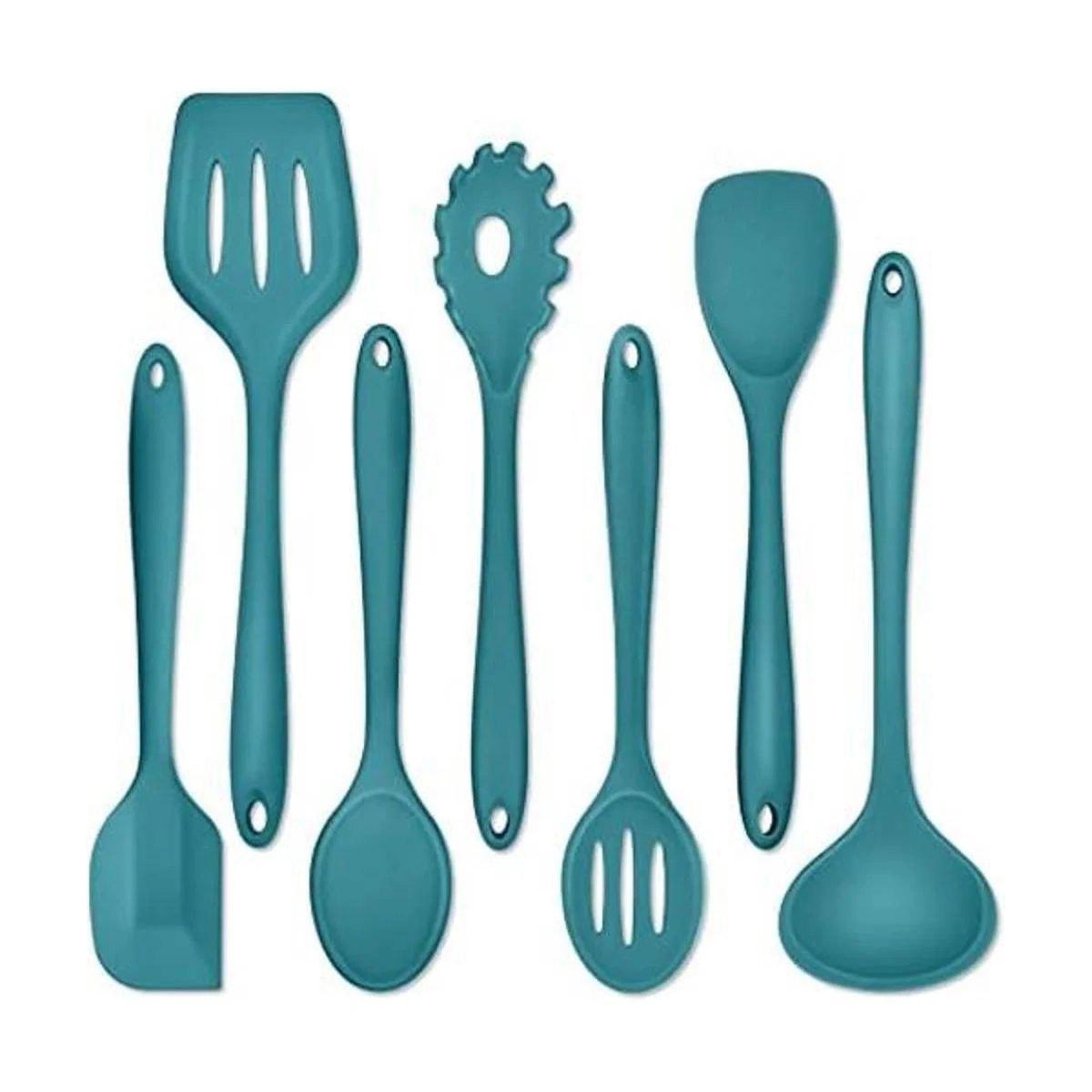 Resistente al calor: cada utensilio de silicona es resistente al calor hasta 446 F, cucharón o cuchara sólida para servir sopa caliente, espátula o espátula de cuchara para batir mantequilla caliente o salsa de chocolate caliente, el volteador puede freír verduras, el servidor de pasta puede agarrar fideos y pasta rápidamente del agua caliente, la cuchara ranurada también es conveniente para recoger la carne de la sopa caliente