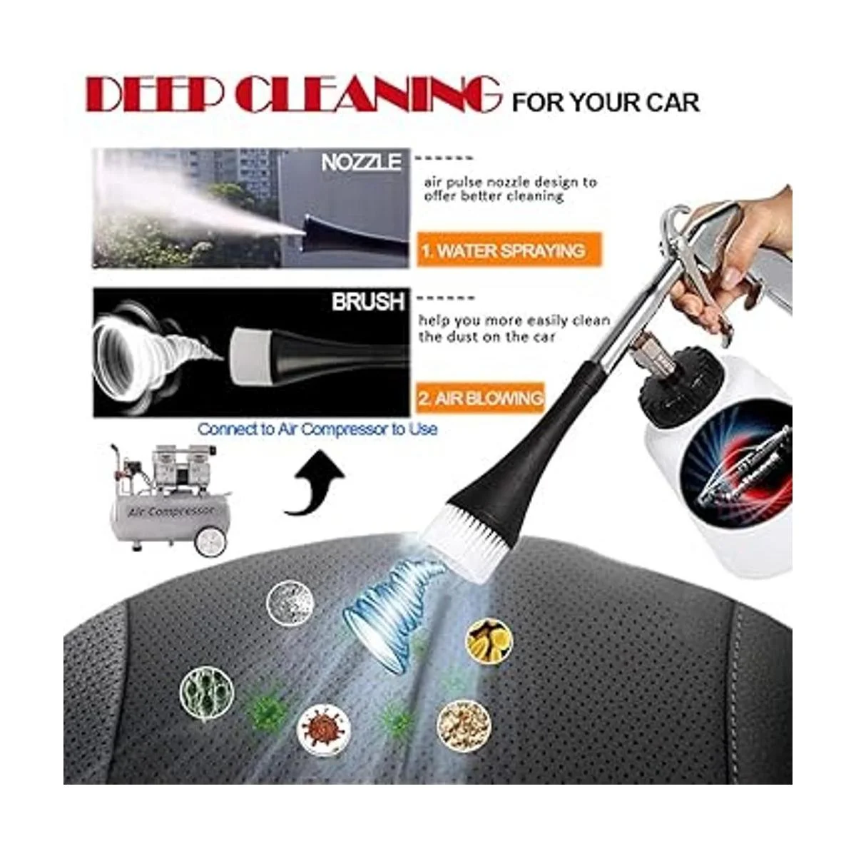 Diseño 2 en 1: de limpieza de aire con práctica válvula azul, simplemente tira hacia arriba para obtener modos de limpieza y presiona hacia abajo para obtener los modos de de aire. de limpieza: chorro de aire y mejor niebla para ayudar a eliminar la suciedad y las manchas en cualquier superficie y zonas de difícil acceso; sopladora de aire flujo de aire fuerte para eliminar el polvo y secar al aire Podrías convertirte en un detalle profesional de automóviles, nunca pierdas tiempo y dinero en el trabajo de detalles del coche