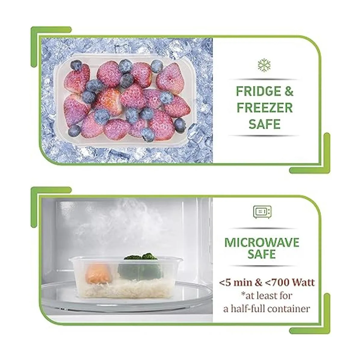 A diferencia de otros juegos de recipientes que se derriten, deforman o gotean, nuestro juego de contenedores para delicatessen aptos para congelador y microondas tiene una construcción robusta y sólida y tapas cómodas para asegurarse, tu comida permanece en los recipientes de plástico. No hay desagradables derrames sorpresivos en la lonchera, en los asientos del automóvil, en la ropa o en cualquier otro lugar. Tú, tu automóvil, tus pertenencias y tu comida llegarán donde deben llegar, como se supone que deben llegar, ya sea de la nevera al mostrador o de casa al trabajo.