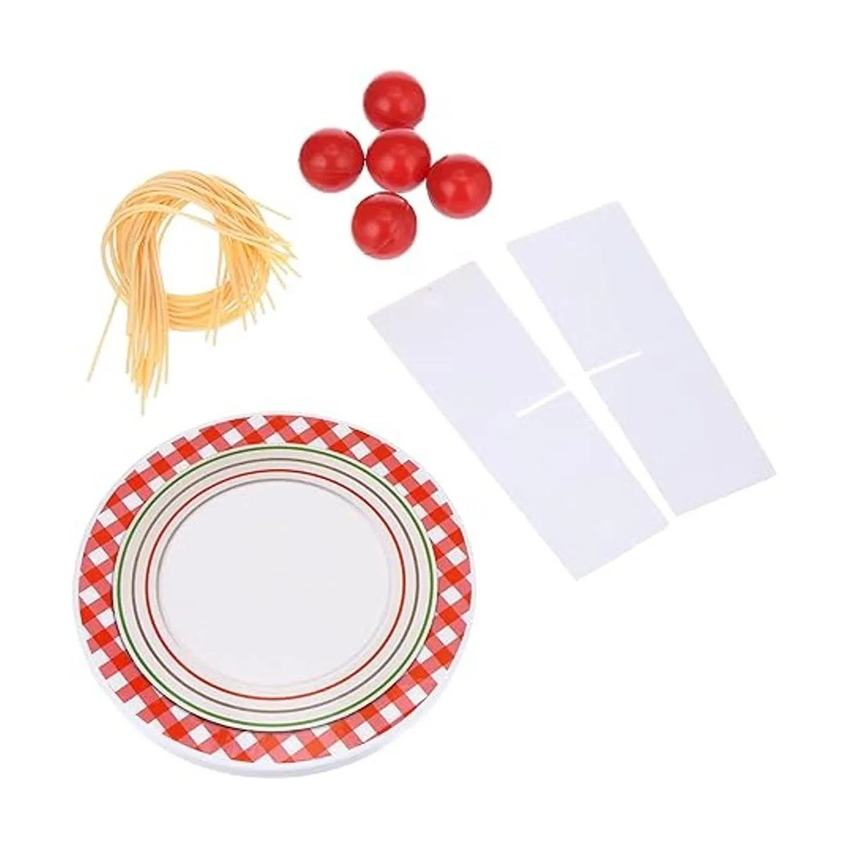El contenido incluye mesa, base de mesa, 20 hebras de espaguetis, 5 albóndigas y reglas
