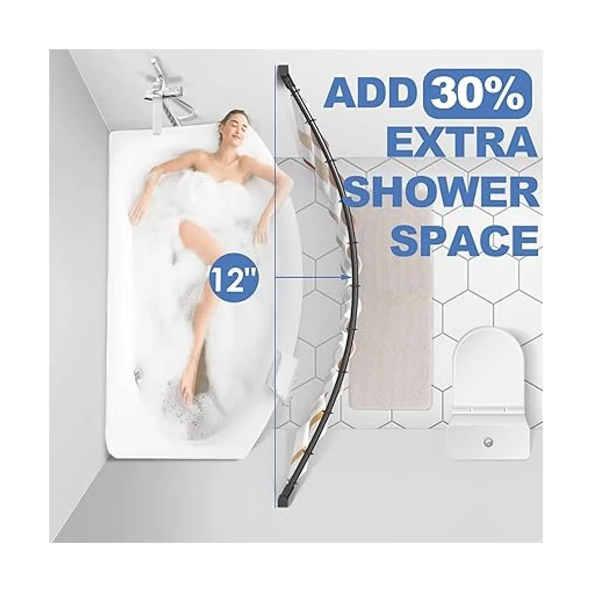 Espacio de ducha adicional: a diferencia de los postes de ducha de tensión recta tradicionales, nuestro diseño curvado de primera calidad barre alrededor de tu bañera maximizando el espacio, proporciona un espacio adicional de ducha de 12 pulgadas. La cortina de ducha húmeda se curva alrededor de tu bañera y no la tocarás, aumenta tu espacio de codo