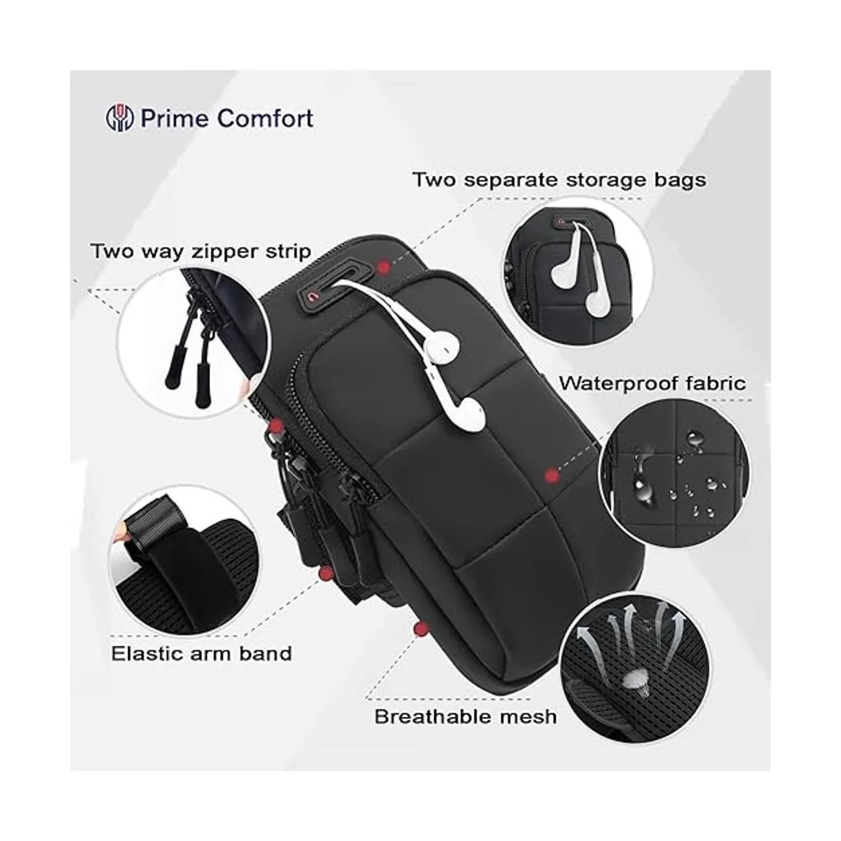 Prime Comfort Bandas de brazo para teléfono para correr, brazalete para teléfono celular para ejercicio negro