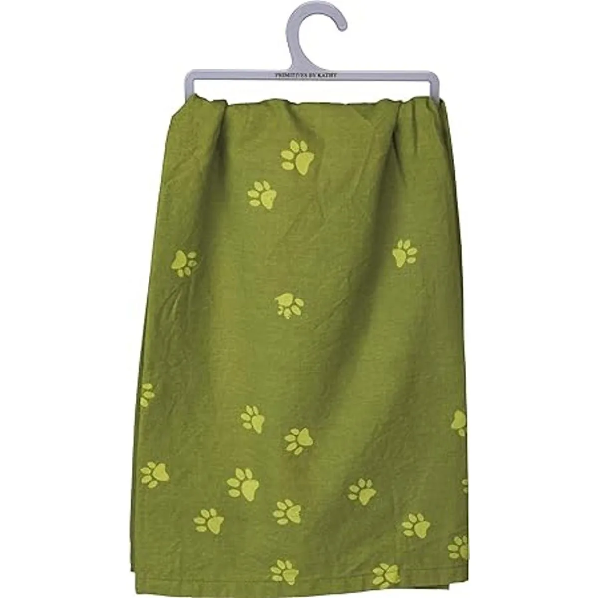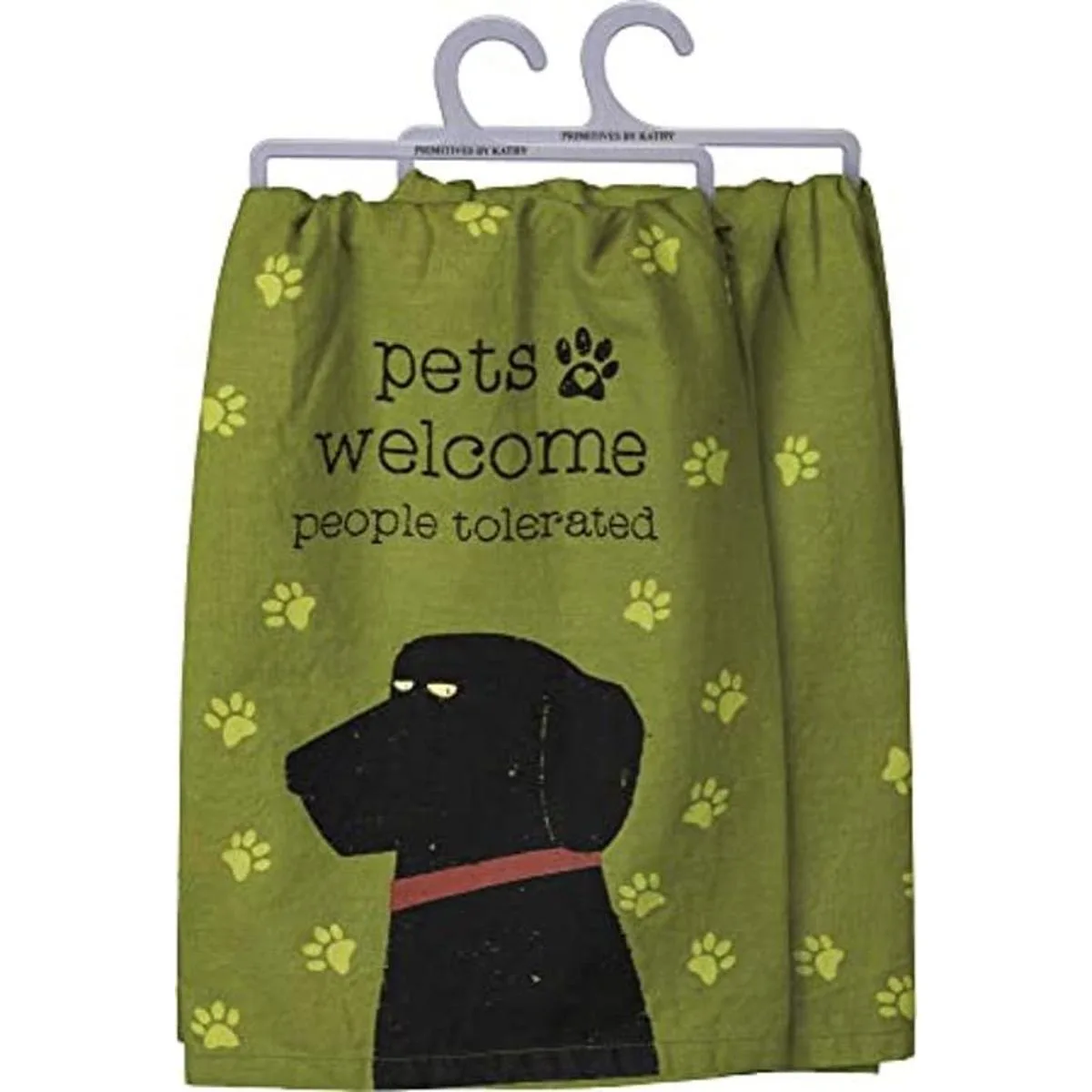 Un paño de cocina de algodón con un sentimiento de Pets Welcome People Tolerated con diseño de perro y un patrón de estampado de patas completo.