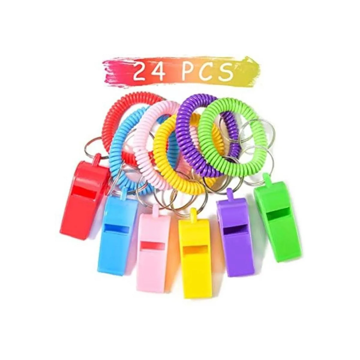 PRLOSO 24 pulseras de silbato con llavero para niños de fiesta de recuerdo de plástico deportivo silbato juguetes a granel