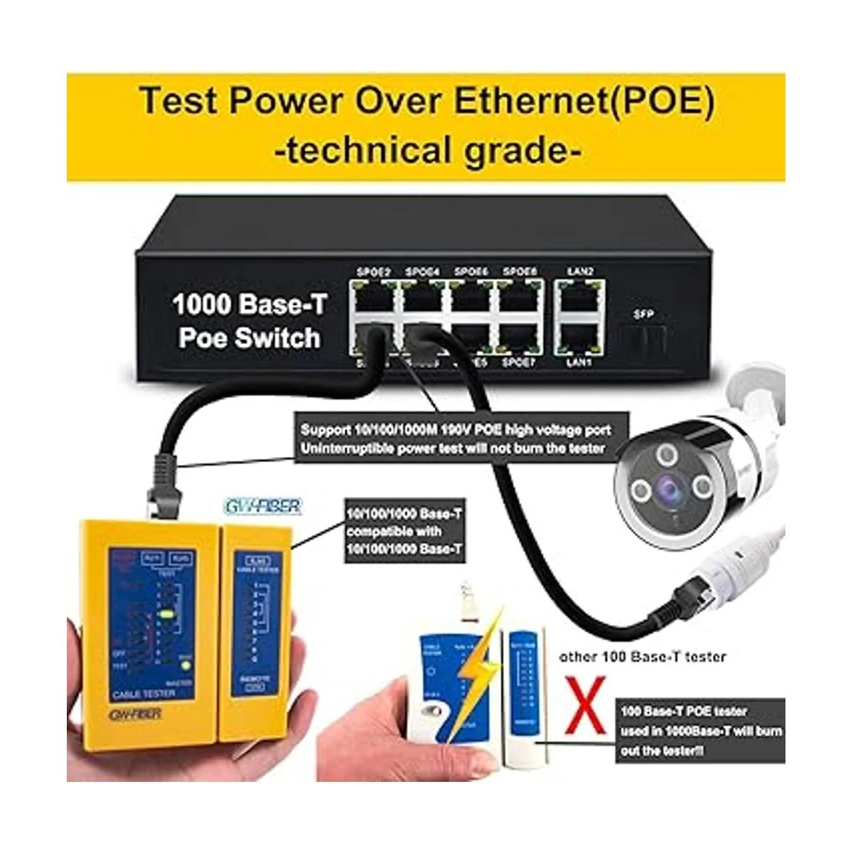 Actualizado,probador de cable de red PoE, prueba el puerto de red POE en el estado de funcionamiento del interruptor de alimentación POE de alta potencia. El probador no se dañará en el estado de voltaje de 129 V, y no te preocupes por fallos repentinos del probador debido al umbral de potencia. Por lo que es un probador de cable de red con buena compatibilidad