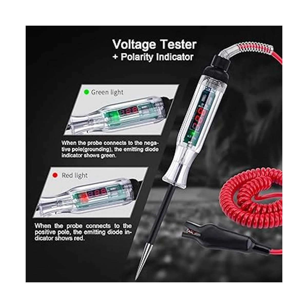Prueba de voltaje bidireccional Puedes fijar la abrazadera de cocodrilo ya sea a tierra negativa o positiva, también hay un diodo emisor de luz en la placa del circuito para indicación de polaridad, la luz roja indica polaridad positiva y la luz verde indica polaridad negativa.