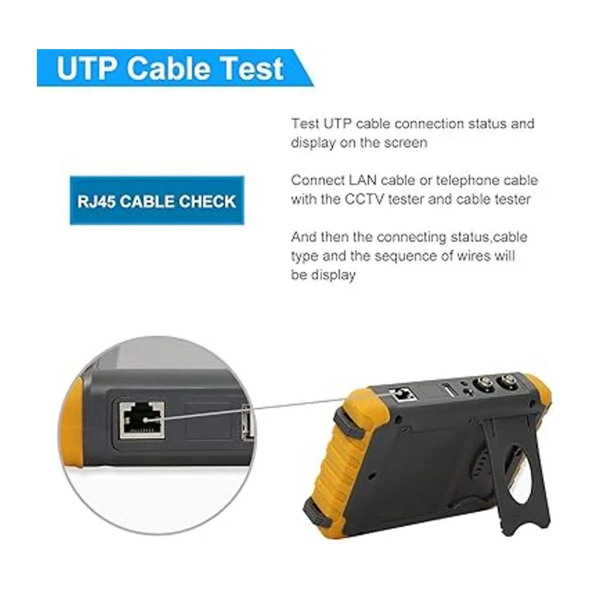 Este probador de cámara también cuenta con una unidad de prueba multiusos que incluye probador/controlador PTZ integrado, prueba de cable UTP, prueba de vigilancia de audio y salida de potencia.