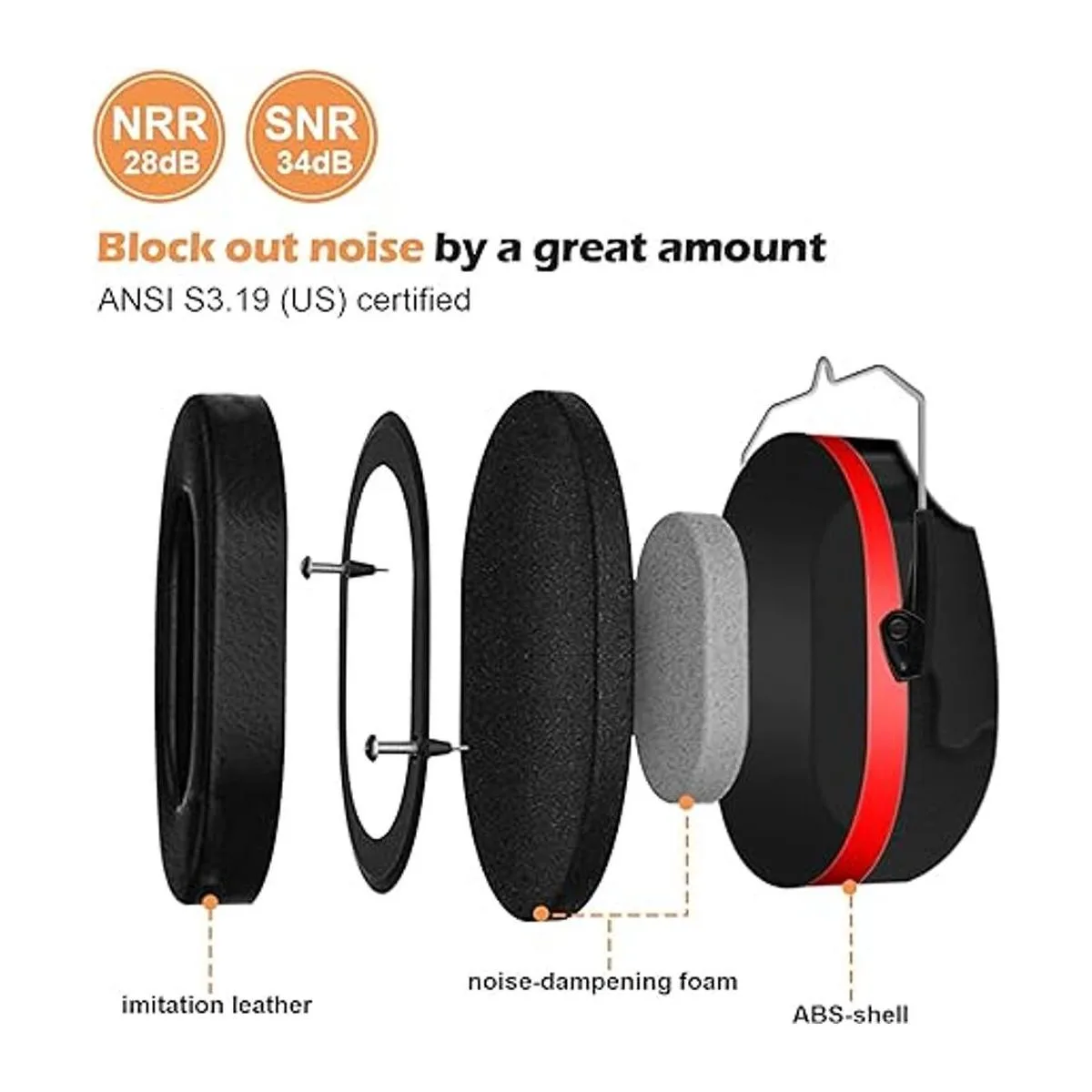 Están fabricadas con carcasa ABS sólida y espuma gruesa que amortigua el ruido. Las orejeras ofrecen una calificación NRR 28dB y bloquean el ruido en gran cantidad. Cuenta con certificado ANSI S3.19 US.