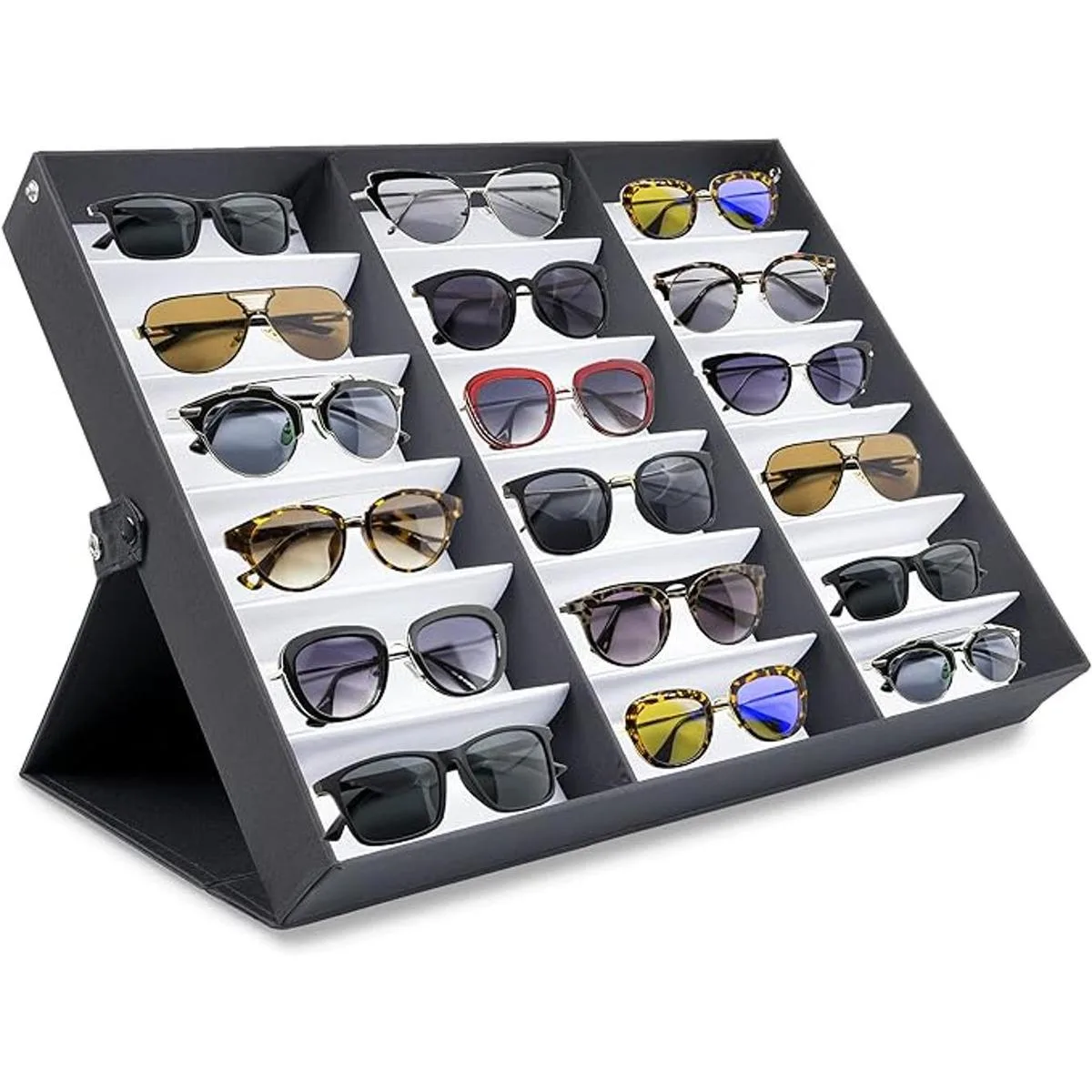 Muestra tus artículos: muestra fácilmente tus artículos en tu hogar o en tienda con este soporte para gafas. El soporte plegable apoya todo el organizador para ayudar a presentar mejor los artículos. Dobla el soporte para que la funda se coloque plana.