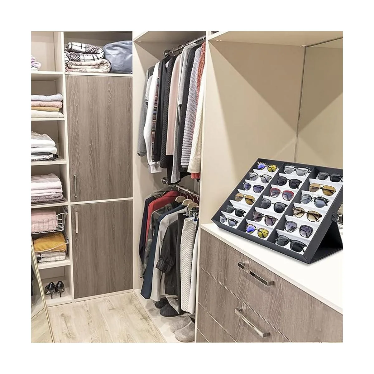 Mantente organizado: mantén todos tus lentes de sol juntos y organizados con este práctico soporte. La funda dividida le da a cada artículo su propio lugar y te permite ver todos los artículos a la vez. Colócalo en tu tocador, en tu armario o cajón para un fácil almacenamiento.