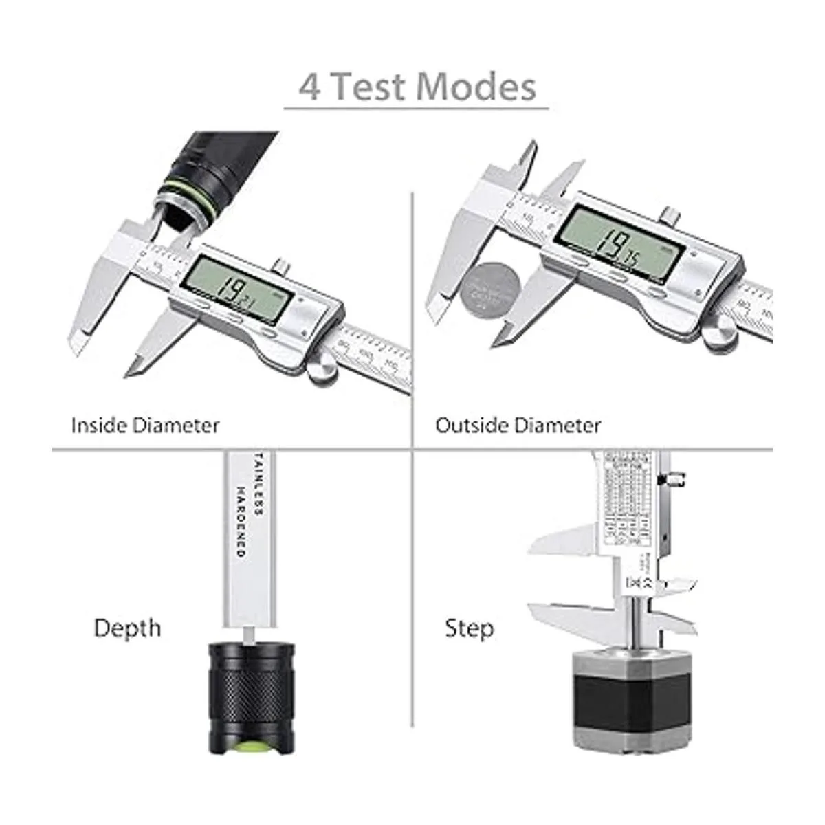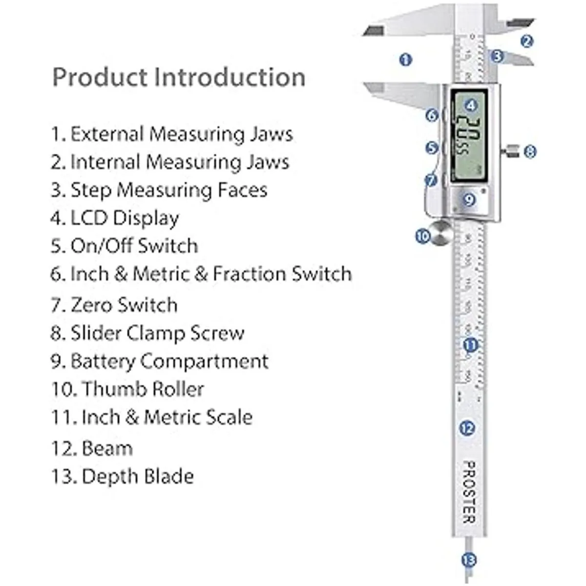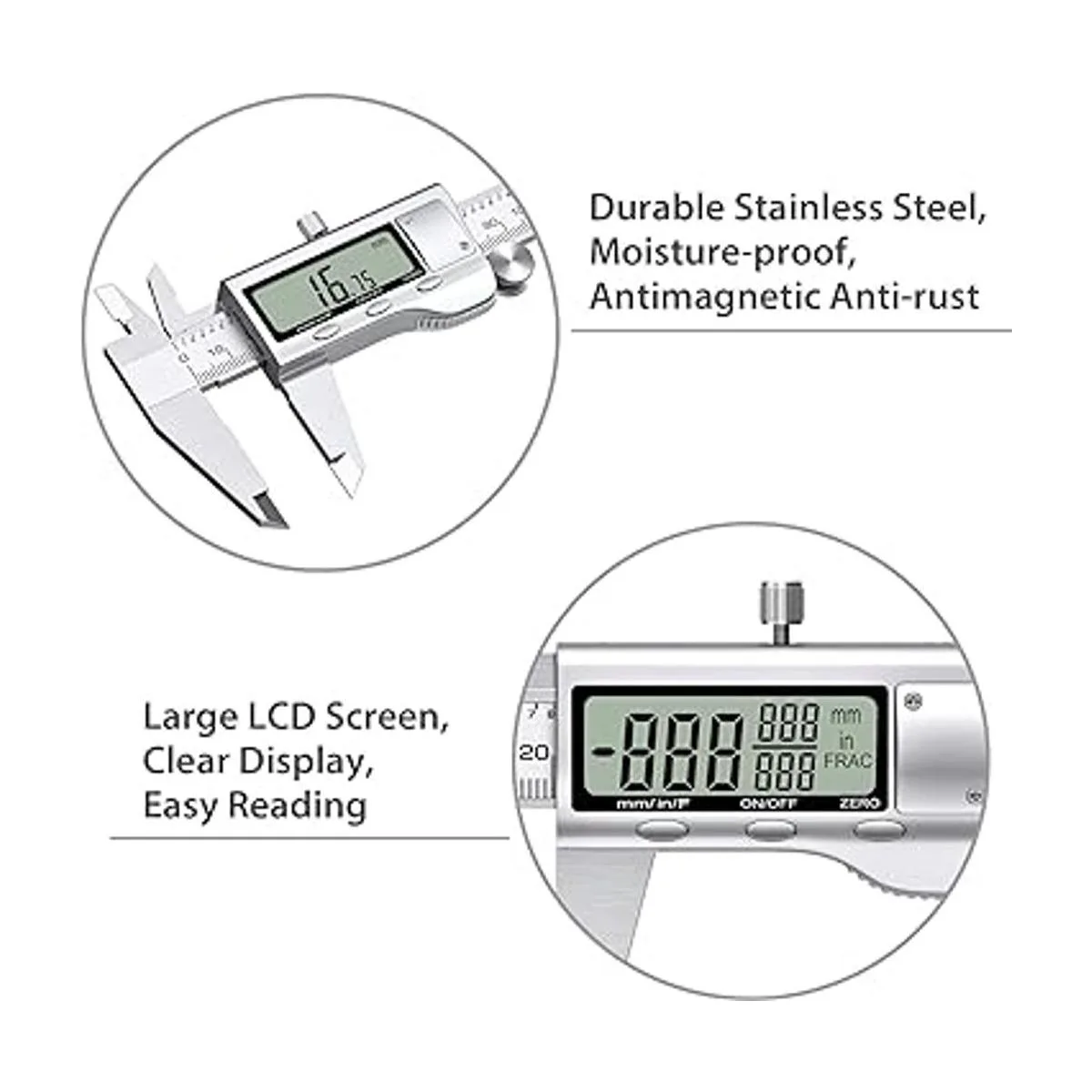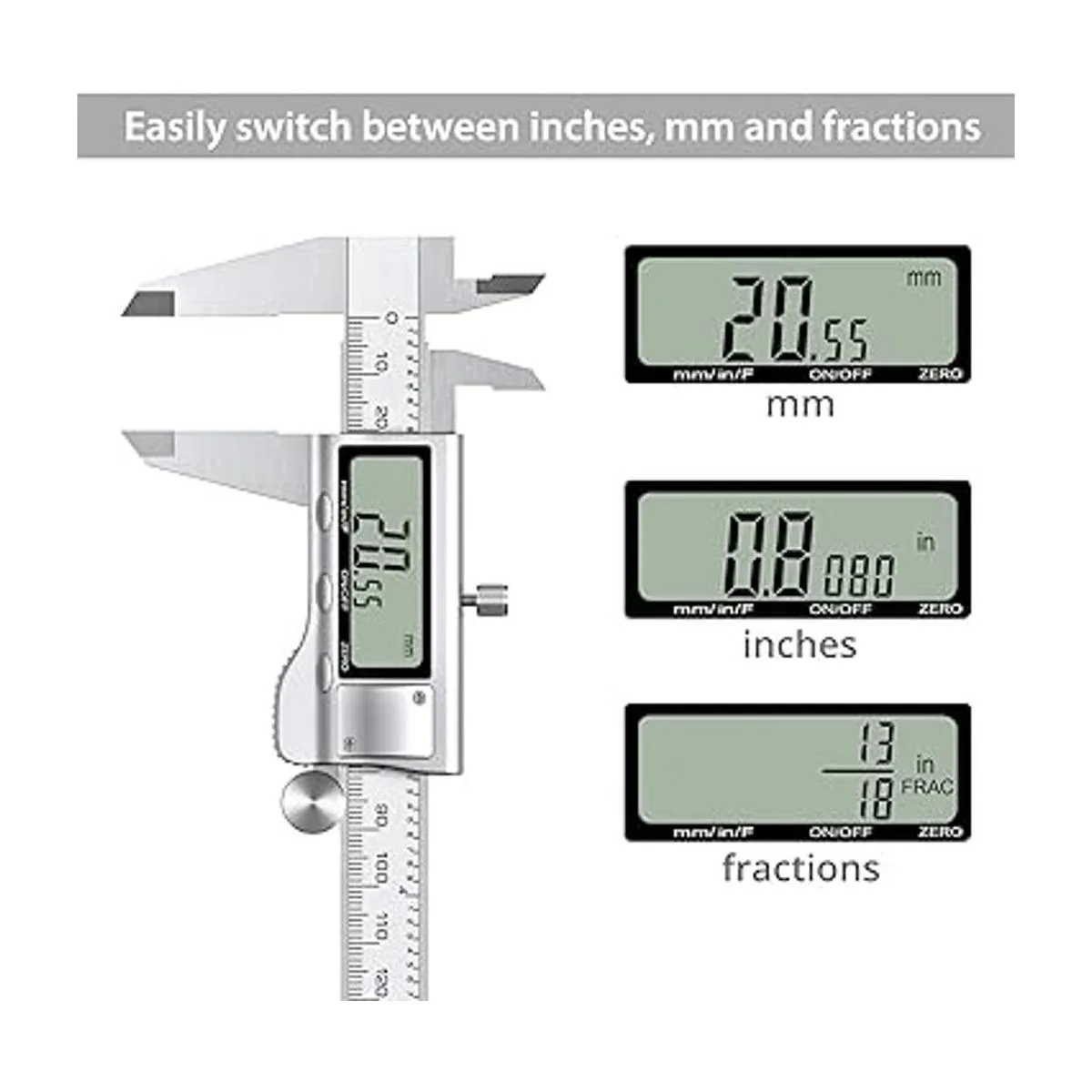 Fácil medición y fácil lectura Encendido/apagado automático, mide el interior, exterior, profundidad y paso con mandíbulas y sonda; pantalla LCD extragrande, conversión de fracción/pulgadas/métrica, para una lectura fácil y precisa