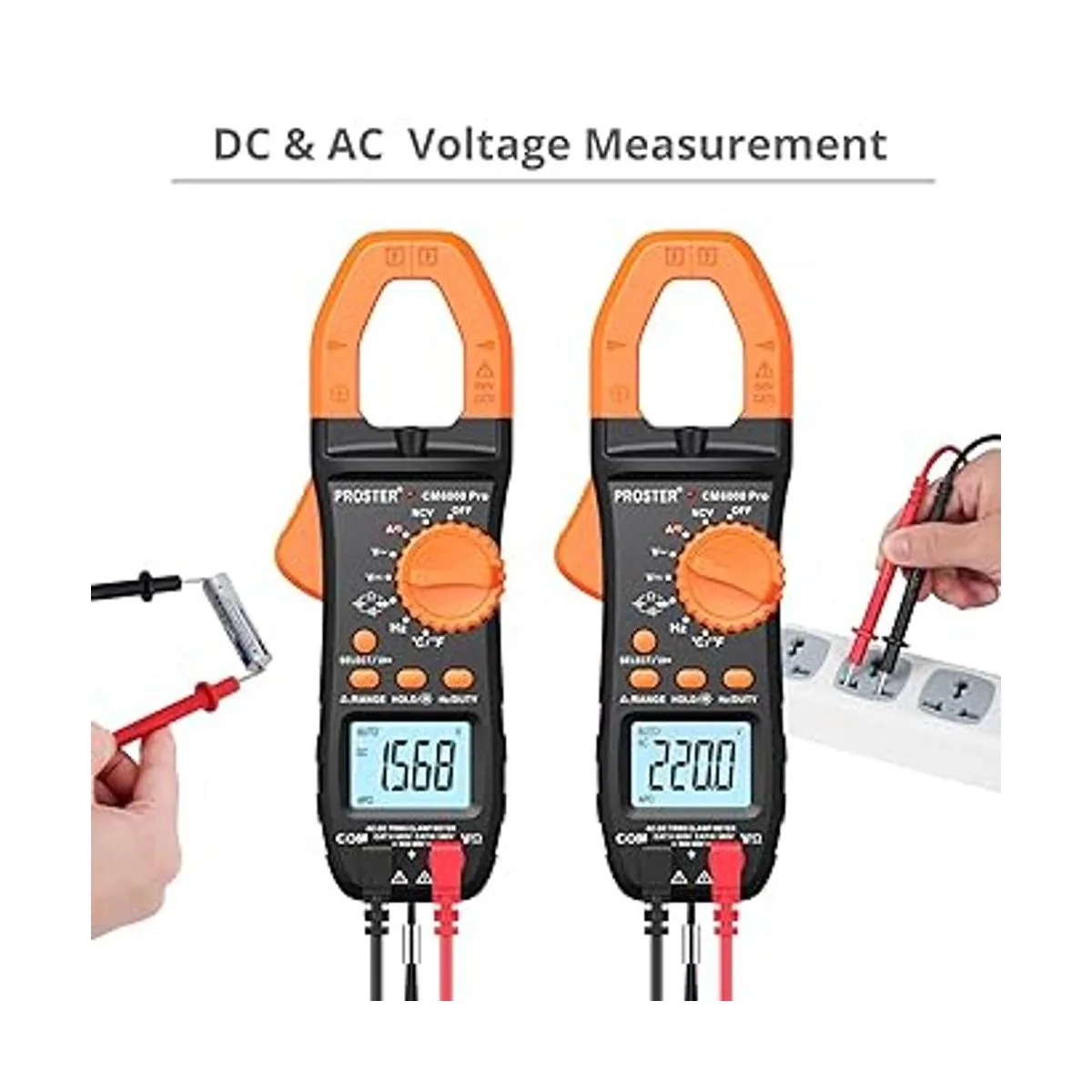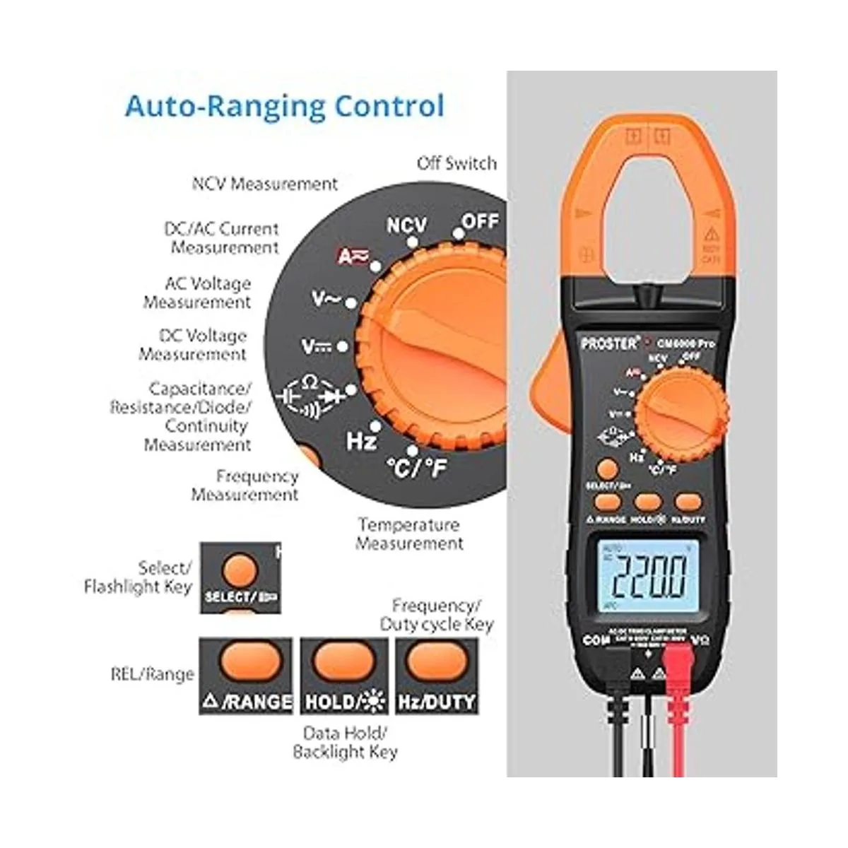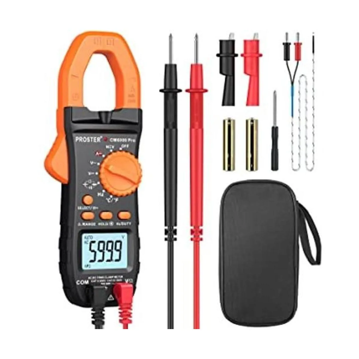 Proster Medidor de abrazadera digital TRMS 6000 unidades, 800 A CC corriente CACC voltaje NCV continuidad capacitancia resistencia frecuencia diodo Hz prueba, con 1 par de cables de prueba 1 par de clips de cocodrilo