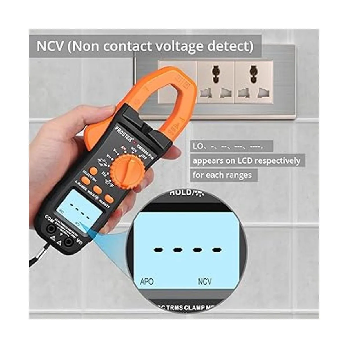 Rango automático con NVC: el medidor seleccionará automáticamente el rango automático adecuado; NCV detecta la existencia de voltaje de CA en conductores y cables en la pared, solucionando problemas eléctricos de una manera segura y fácil de usar