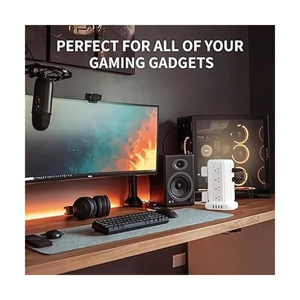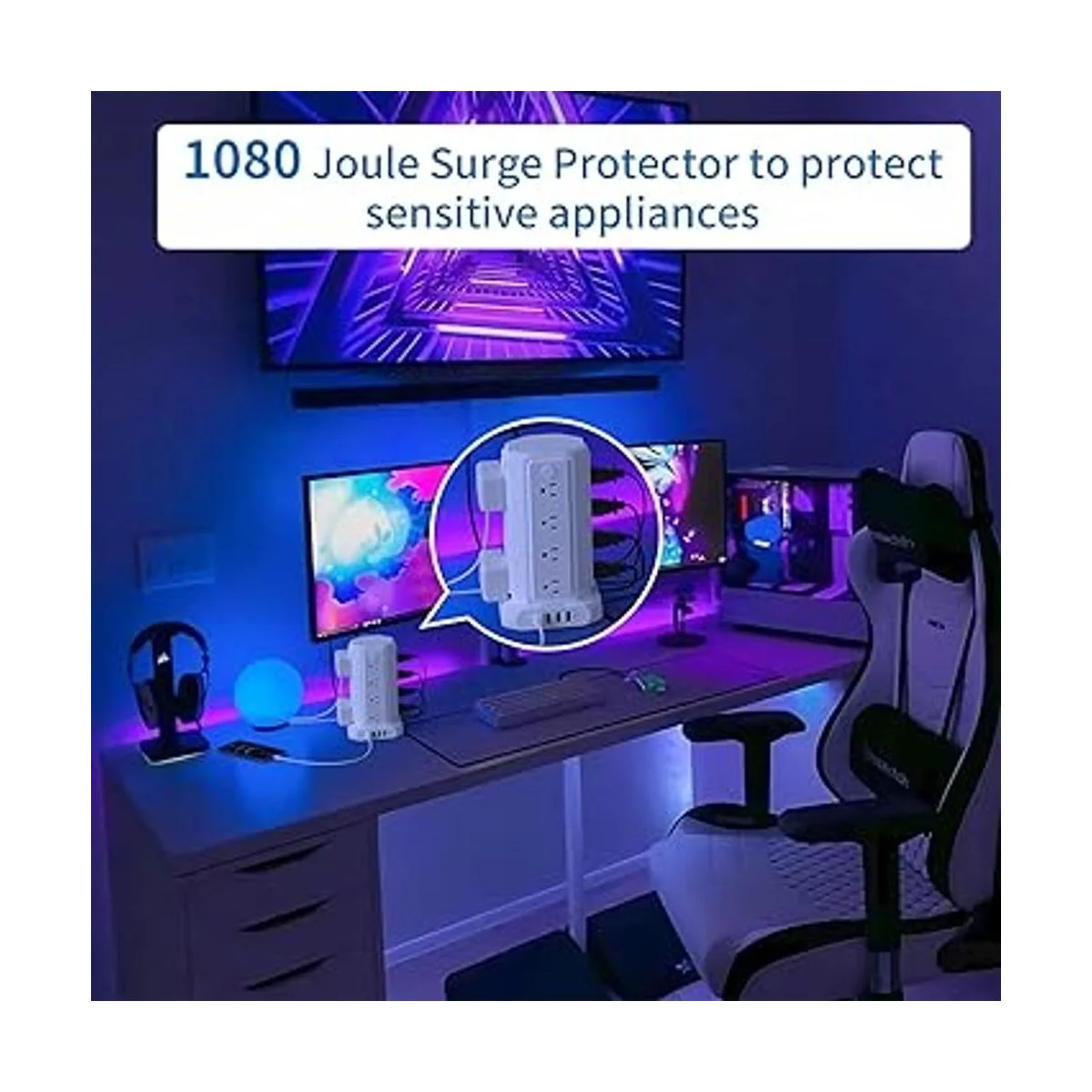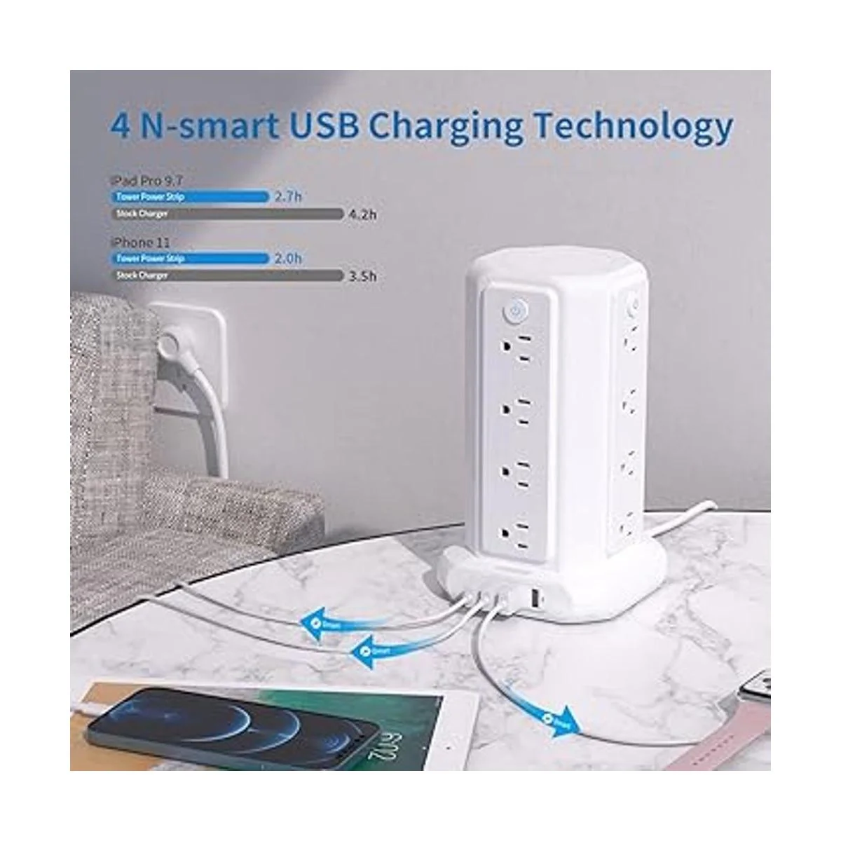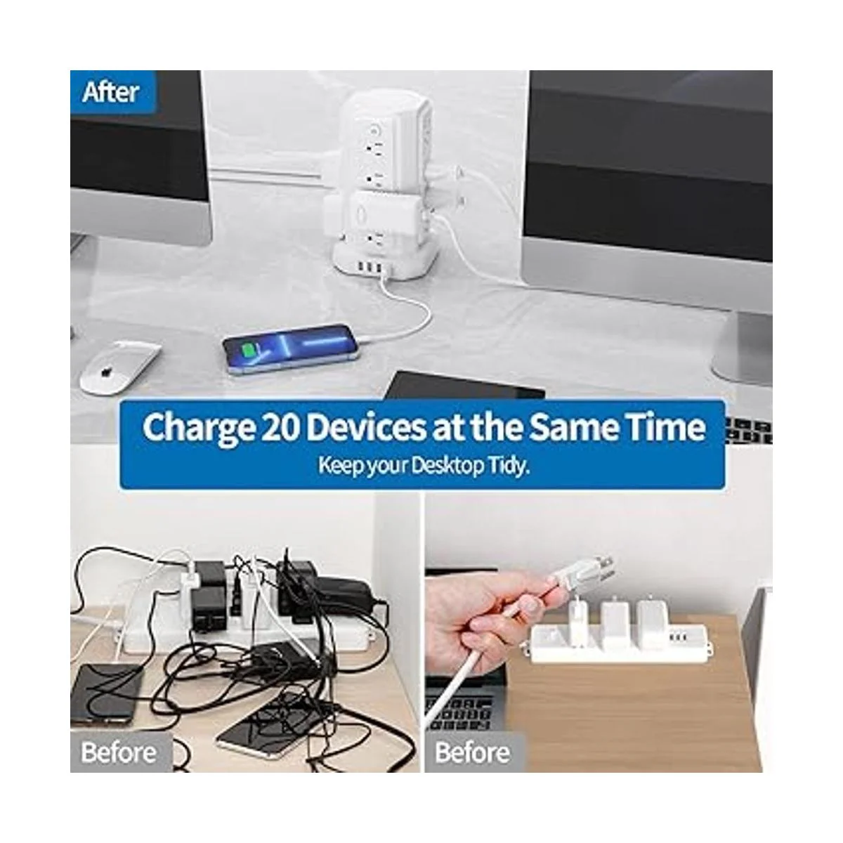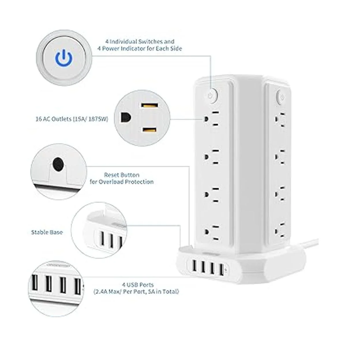 Protector de sobretensiones 20 en 1 Torre de enchufe múltiple de 16 tomas de tierra con 4 puertos de carga USB, maneja tus 20 dispositivos simultáneamente. La potencia total es de hasta 1875 W y el lado USB puede proporcionar 4.2 A máximo actualización / 21 W de potencia en total. Tecnología de carga inteligente USB, cada puerto USB puede detectar y ofrecer una salida de corriente óptima de hasta 2,4 A por puerto.