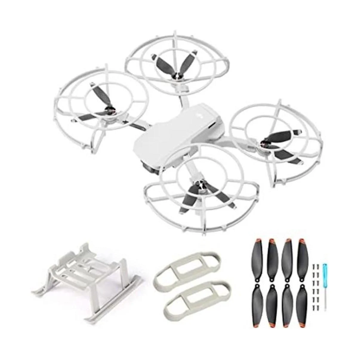 El paquete incluye: 4 protectores de hélice, 2 soportes de hélices, 8 hélices 1 mini destornillador y 12 tornillos, 1 pata de tren de aterrizaje extendida