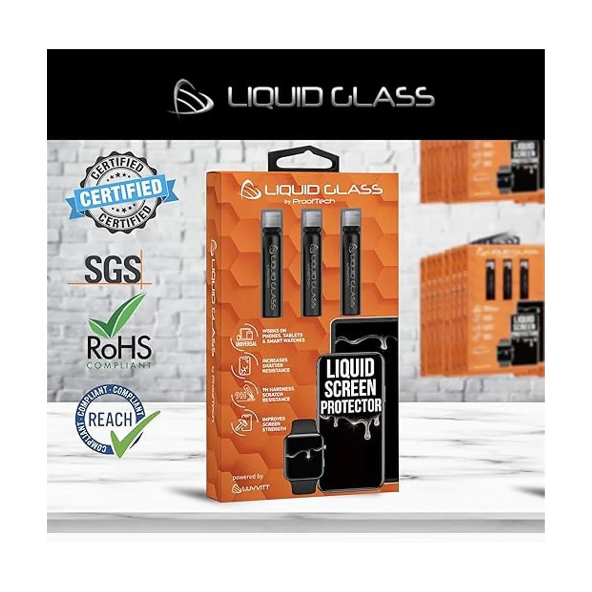 ProofTech Liquid Glass es un protector de pantalla líquido súper duradero y completamente transparente que se adhiere al vidrio de tu dispositivo ofreciendo una resistencia mejorada al impacto y a los golpes. Crea un revestimiento protector invisible que aumenta la pantalla del dispositivo al nivel de dureza 9H.
