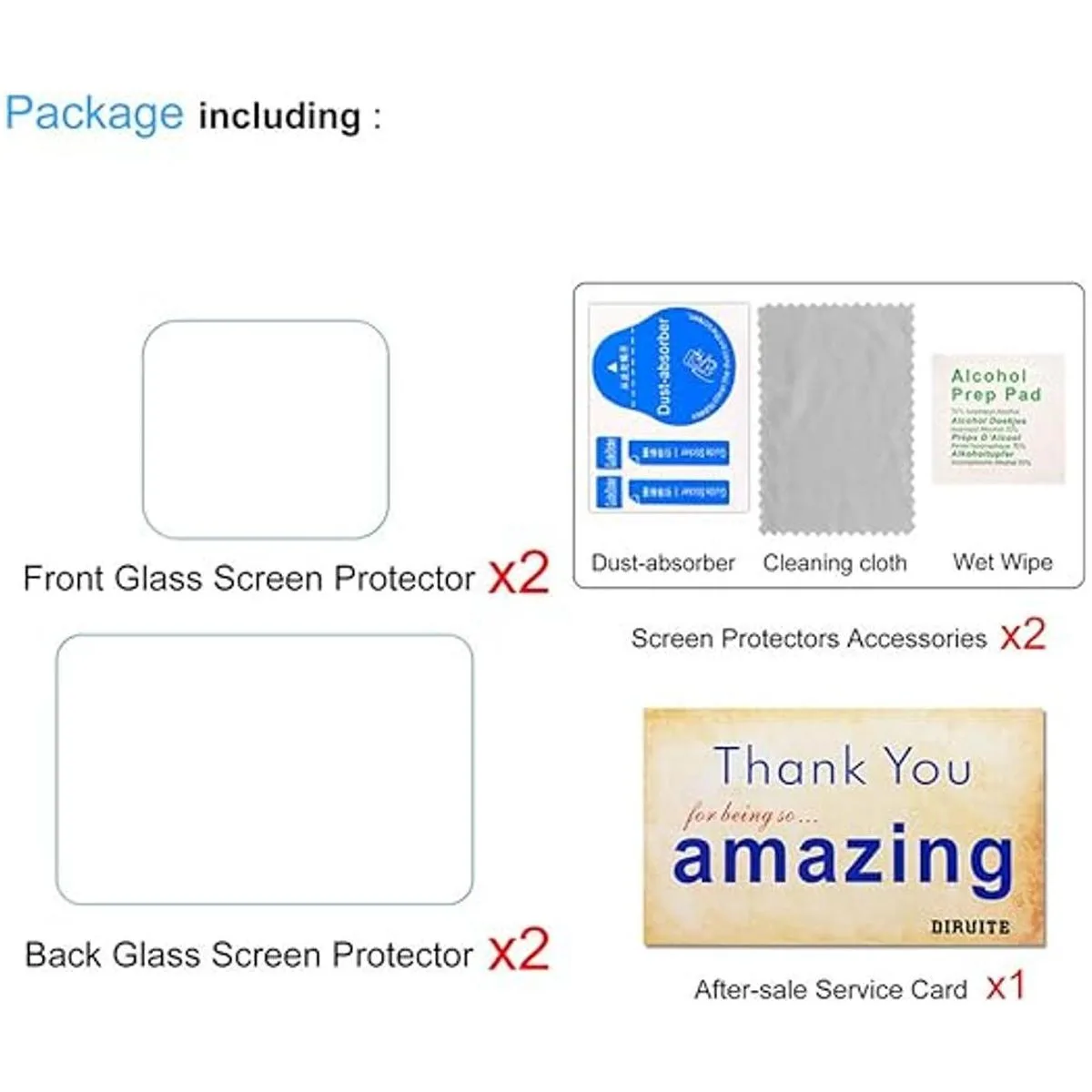El paquete incluye: 2 películas de vidrio templado de protección de pantalla; 2 películas de vidrio templado de protección de lente; 2 kit de limpieza, 1 tarjeta de servicio posventa.