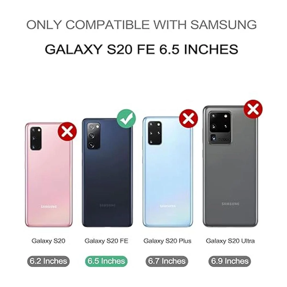 Compatibilidad: esta funda ligera pero resistente solo se adapta a tu Galaxy S20 FE de 6.5 pulgadas, perfectamente sin ninguna sensación voluminosa. Notas: no es compatible con Galaxy S20 de 6.2 pulgadas, Galaxy S20 Plus de 6.7 pulgadas y Galaxy S20 Ultra de 6.9 pulgadas. Comprueba el modelo de teléfono cuidadosamente antes de comprar